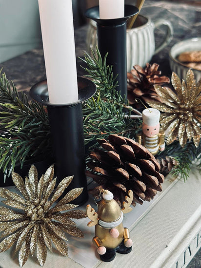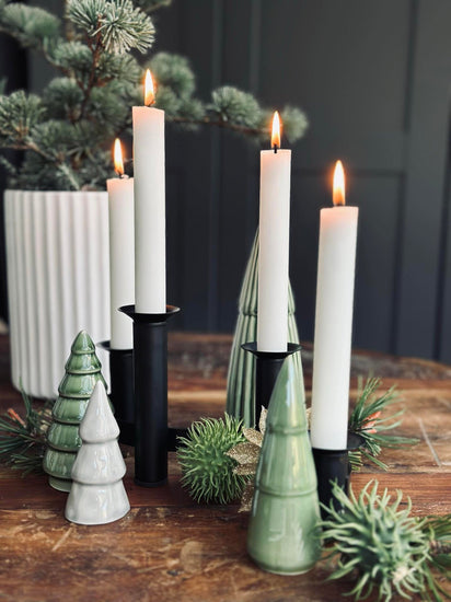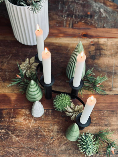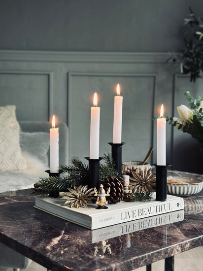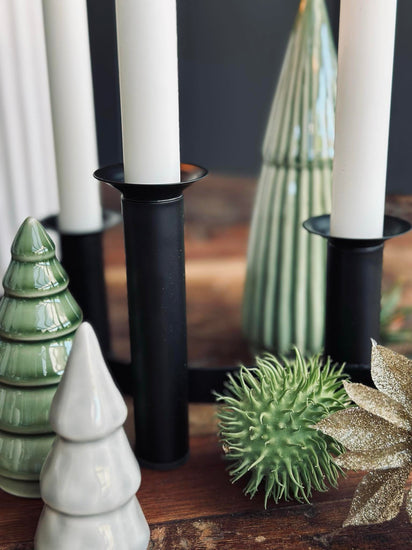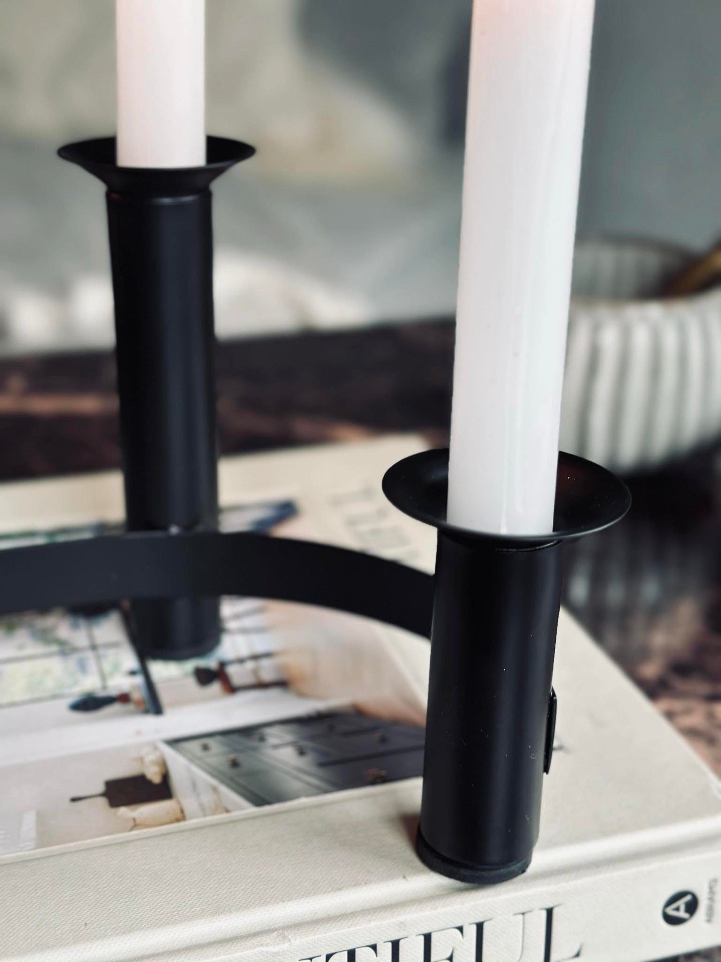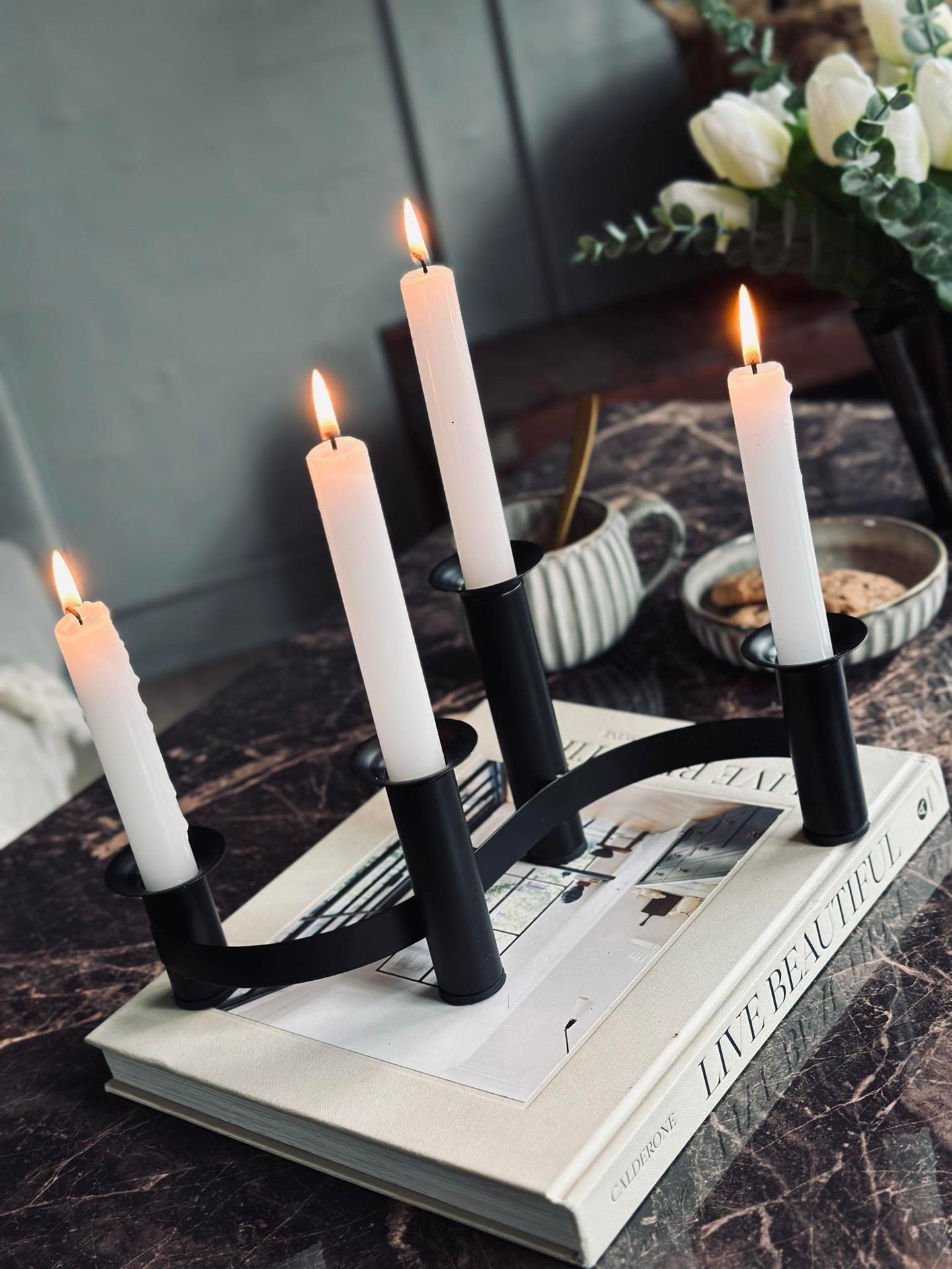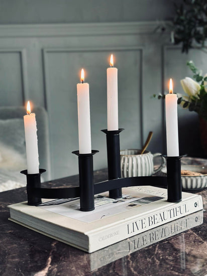 Adventsljusstake - Svart är en enkel design adventsljusstake för kronljus i metall. Den enfärgade, svarta ytan och det lugna, organiska uttrycket gör den lätt att styla i både moderna och klassiska hem. Använd den som ett samlat, dekorativt element i din adventsuppsättning, där ljuset får en tydlig och avvägd plats.