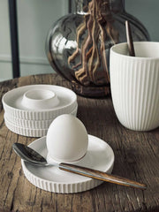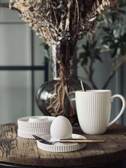 Äggkopparna är tillverkade av melamin, vilket ger dem en hållbar och lätt design. Melamin är känt för sin motståndskraft mot fläckar och repor, vilket gör att äggkopparna behåller sitt fräscha utseende över tid. Dessutom är de enkla att rengöra, vilket sparar tid i köket. Materialet bidrar också till en stabil och säker hantering av äggen.