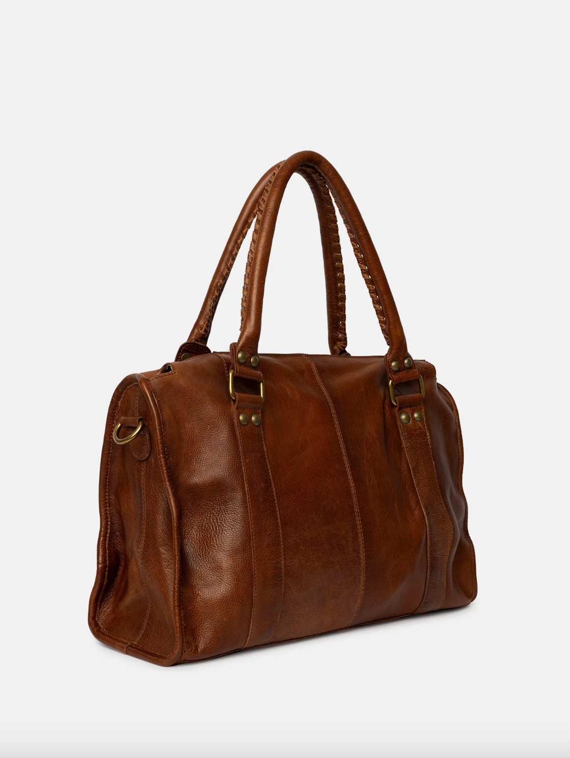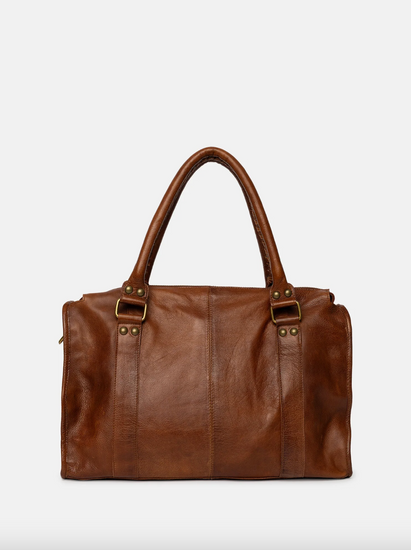 - Framsidan av väskan har två vertikala sömmar och mässingsfärgad hårdvara med spännen och nitar