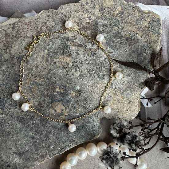 - Armbandet har små avlånga sötvattenspärlor och mellanled i förgyllt sterlingsilver