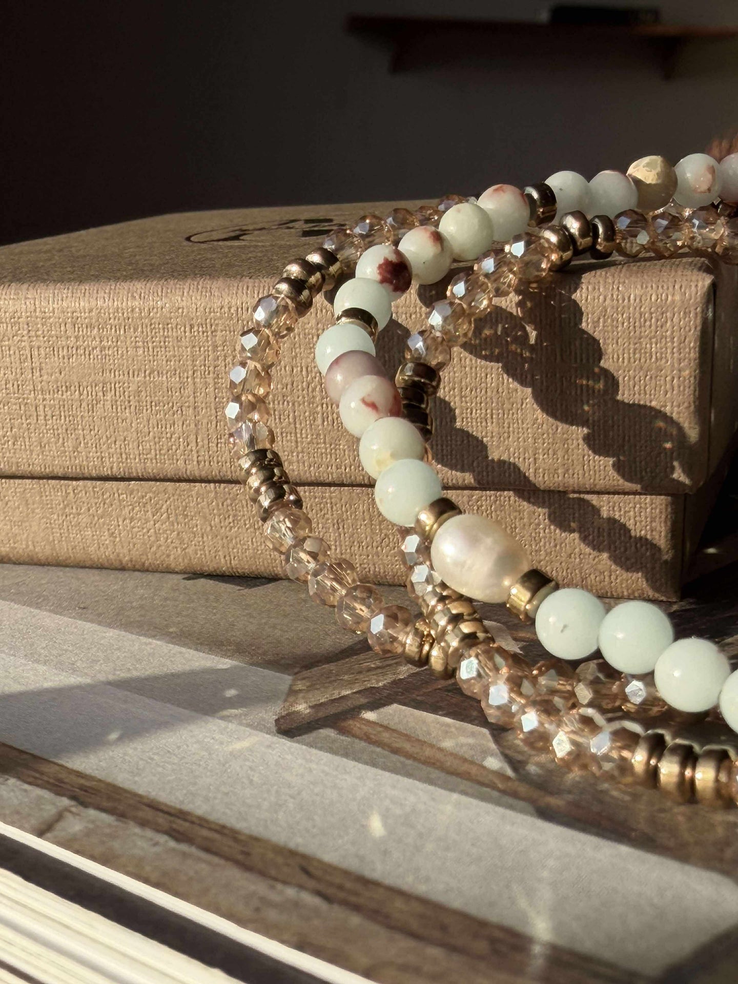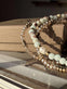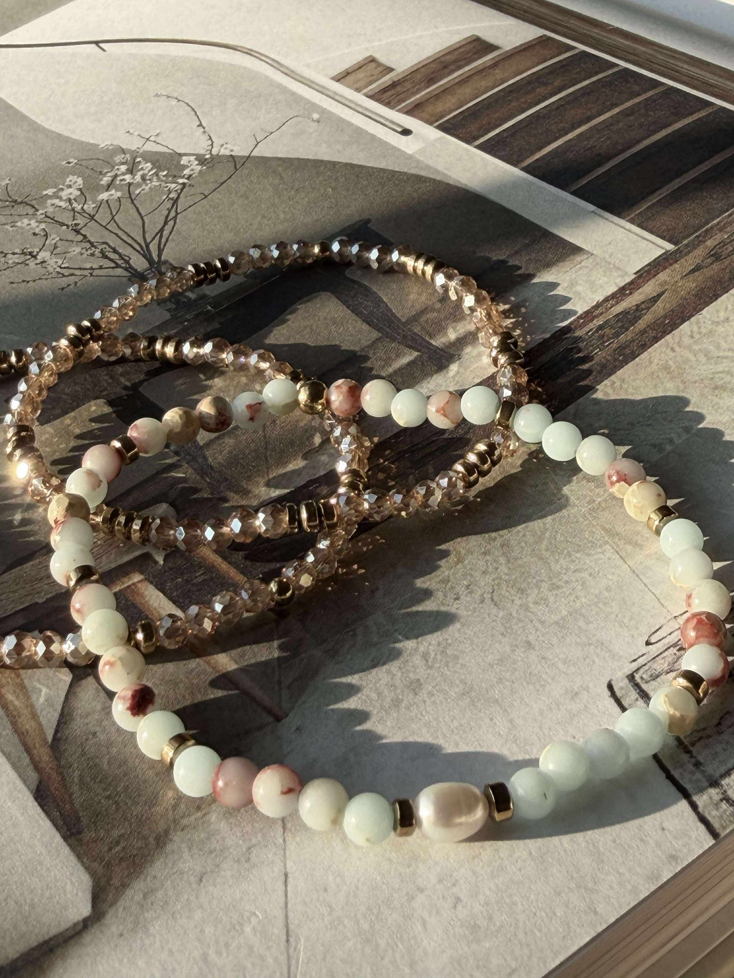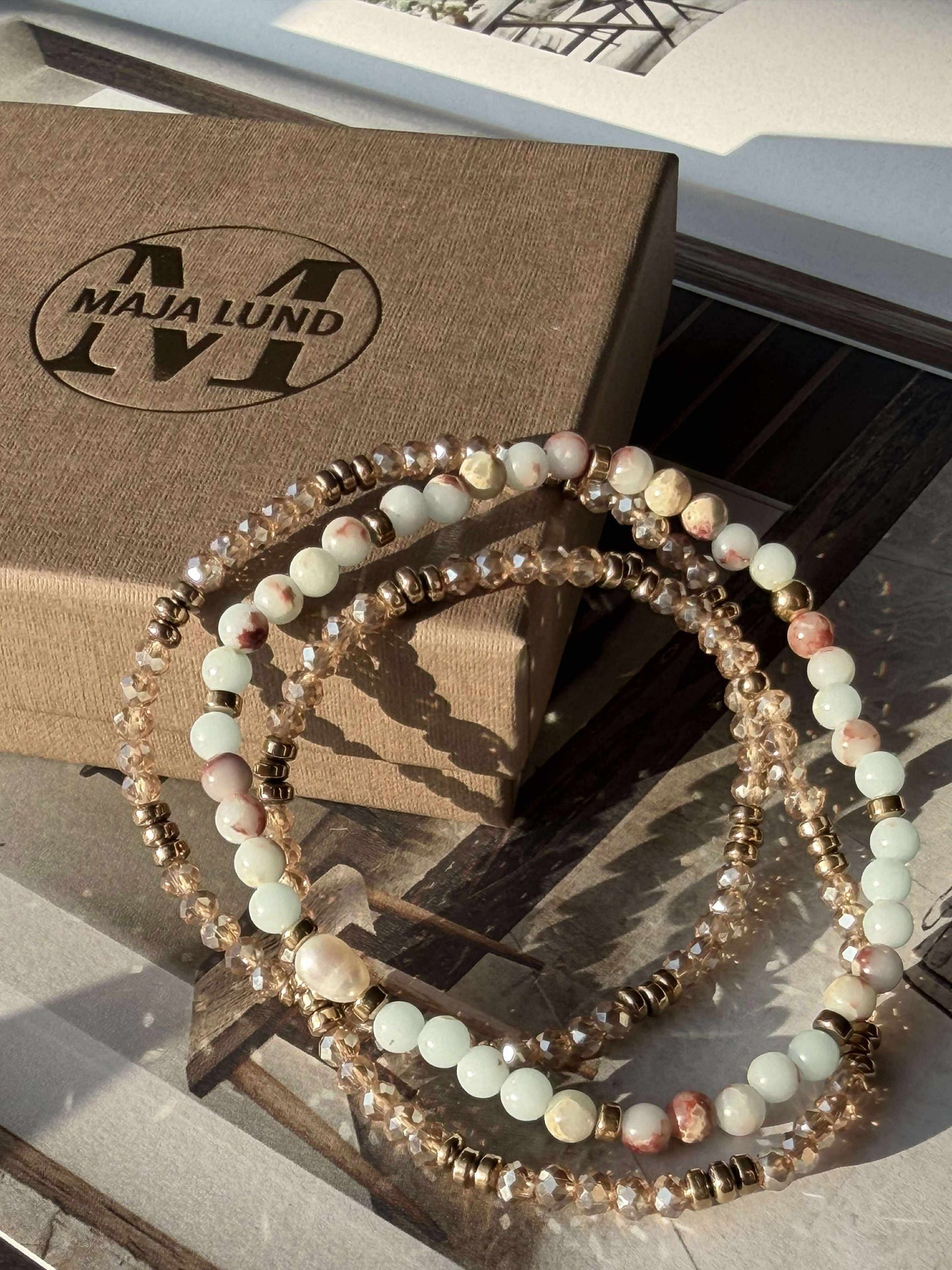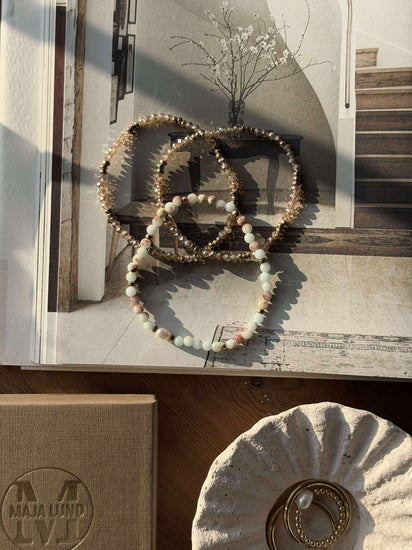 - Det större armbandet i mitten är tillverkat av naturstenar och har en äkta sötvattenspärla