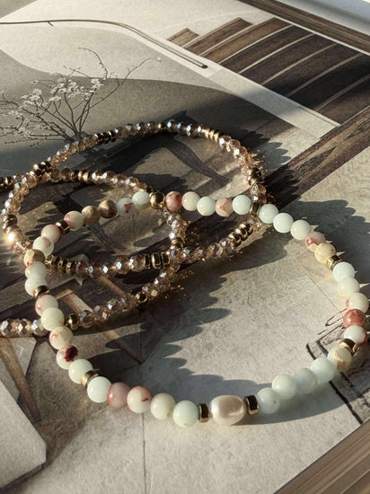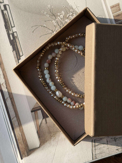 Det större armbandet i mitten av setet är tillverkat av naturstenar och har en äkta sötvattenspärla, vilket ger en känsla av naturlig elegans och tidlöshet. Naturstenarna bidrar med en jordnära estetik som harmoniserar med olika stilar, medan sötvattenspärlan tillför en subtil glans. Kombinationen av dessa material skapar en balanserad och harmonisk känsla som kan berika vilken outfit som helst.