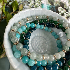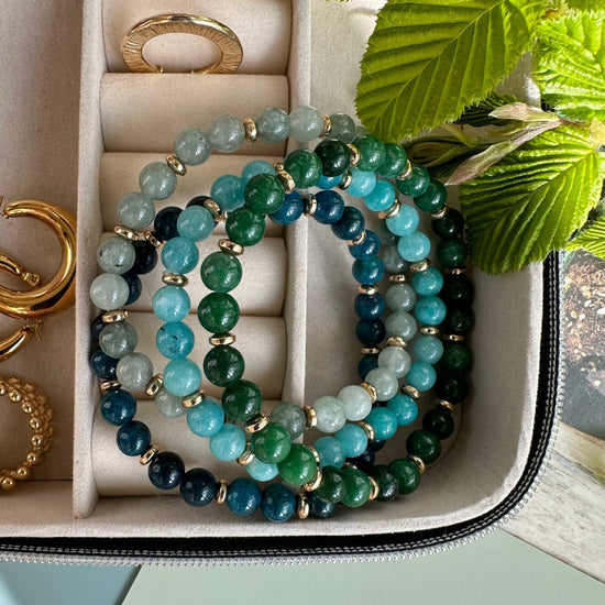 Detta vackra armband kombinerar naturstenar med guldbelagda pärlor. Varje sten har sin egen särprägel och bär energier som kan ge välbefinnande till bäraren. De guldbelagda pärlorna ger en lyxig känsla och ger armbandet en tidlös elegans. Kombinationen av dessa element skapar ett armband som är lika vackert som meningsfullt.