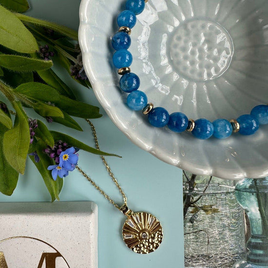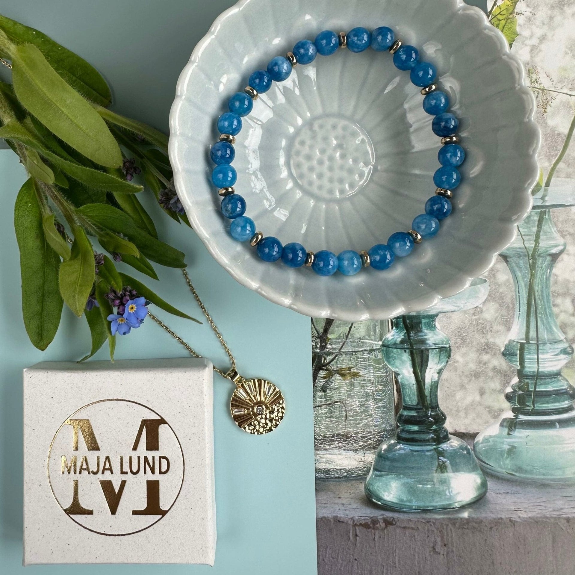 Detta armband i jeansblått är tillverkat av noggrant utvalda naturstenar och pärlor med guldbeläggning. Naturstenarnas speciella egenskaper ger en distinkt och jordnära känsla, medan de guldbelagda pärlorna ger en touch av lyx och elegans. Denna kombination säkerställer att armbandet passar både till vardags och till fest. Dessutom, eftersom varje sten är individuell, blir varje armband ett personligt smycke.