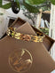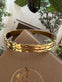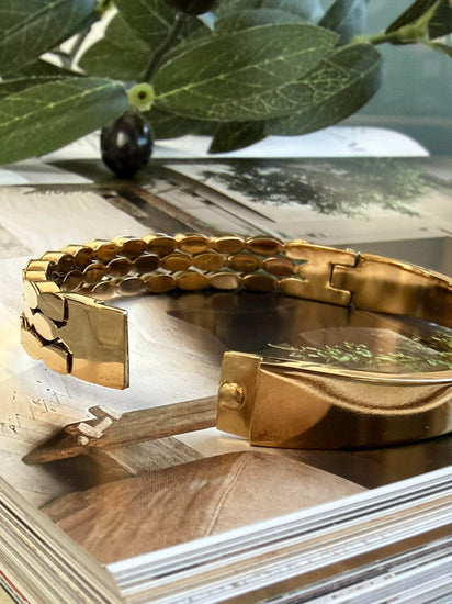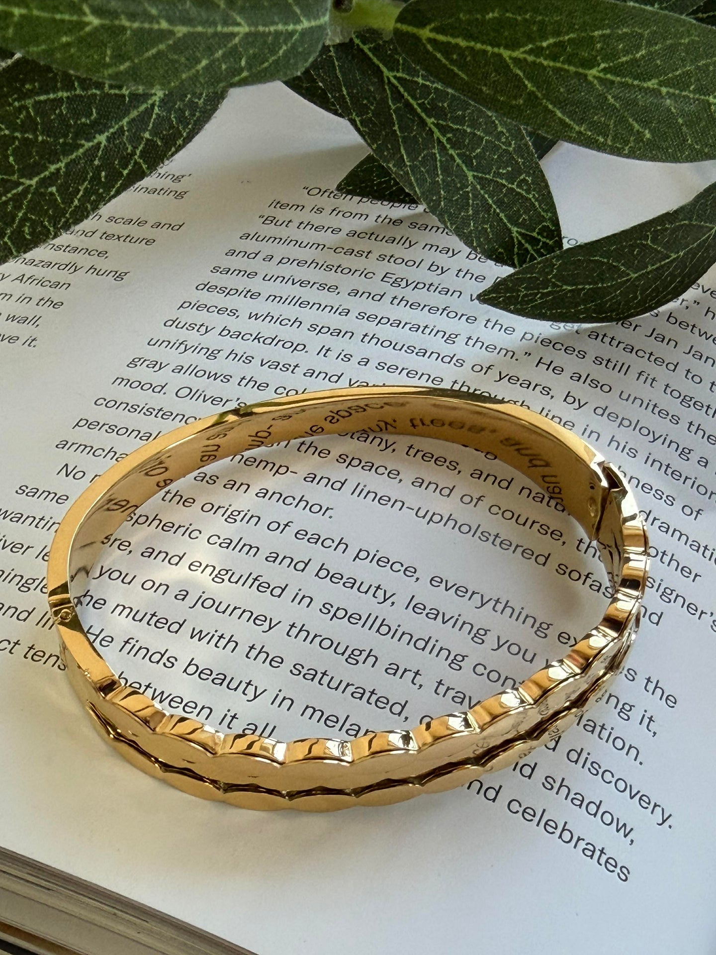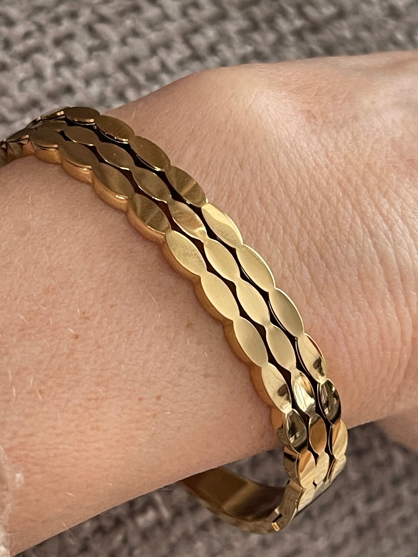 Armringen är utförd i rostfritt stål med 18K förgyllning och har en tydlig textur som fångar ljuset och framhäver detaljerna i designen.