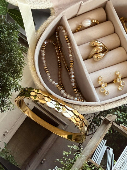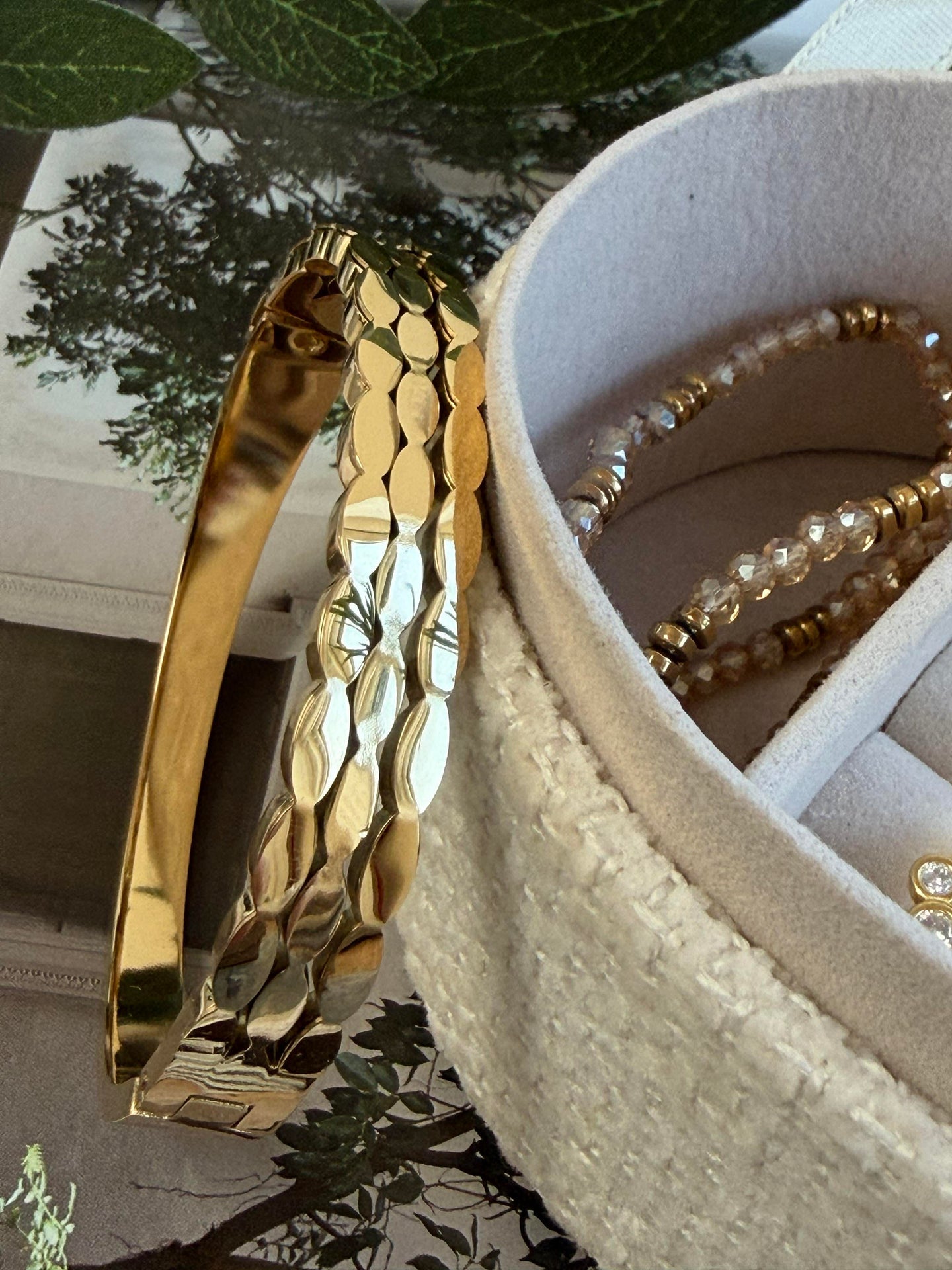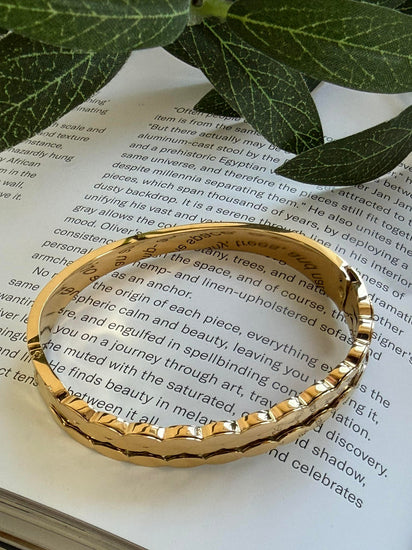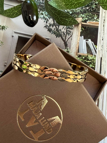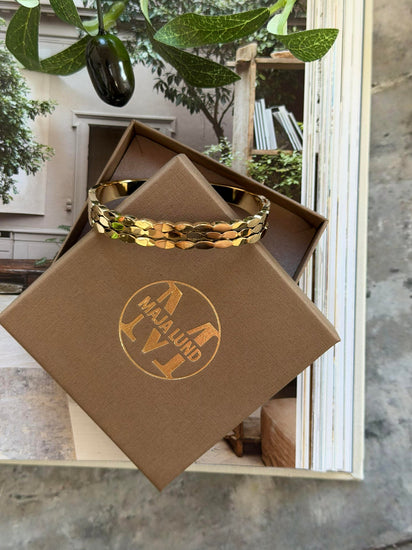 Armring LUCCIA förgylld är en kraftig bangle med ett markant, strukturerat uttryck. Den guldfärgade ytan och det vävda mönstret ger ett karaktärsfullt utseende, som kan bäras ensam på handleden eller matchas med andra smycken.