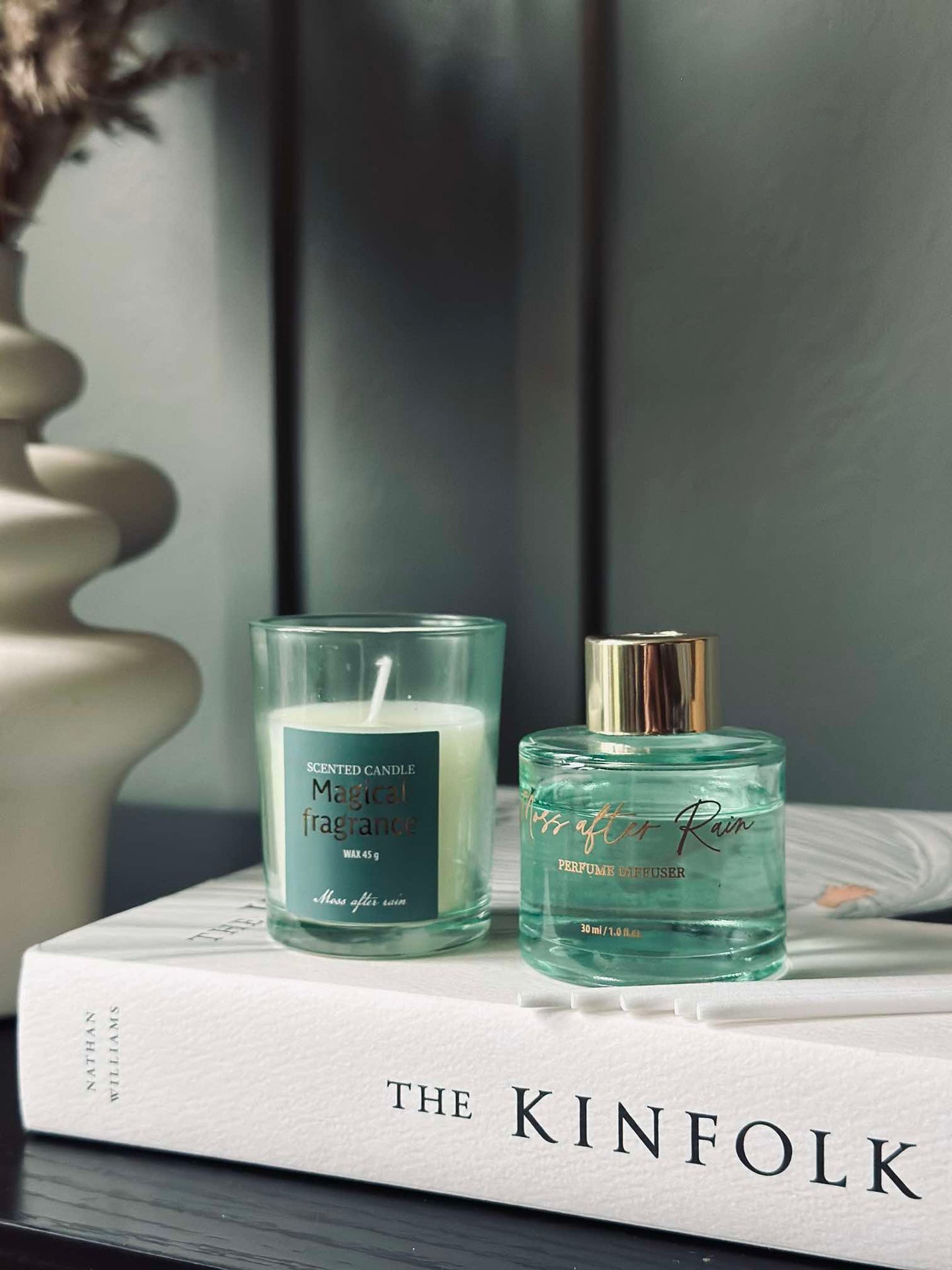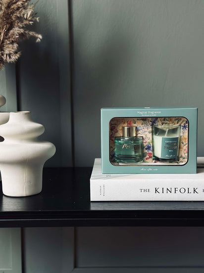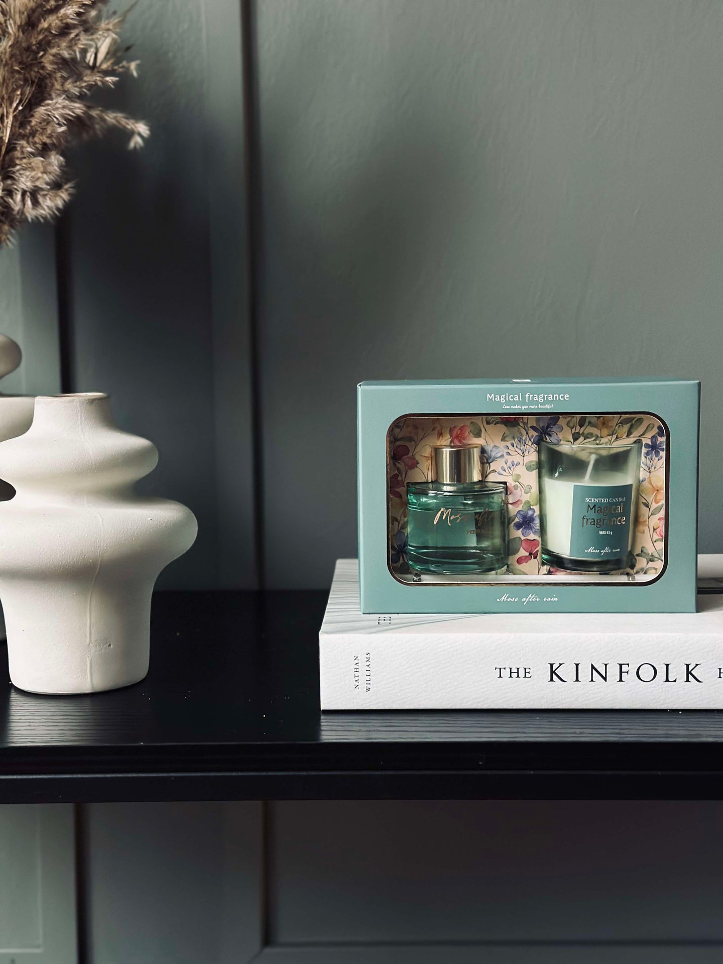 - Aroma gaveset innehåller ett doftljus och en diffuser