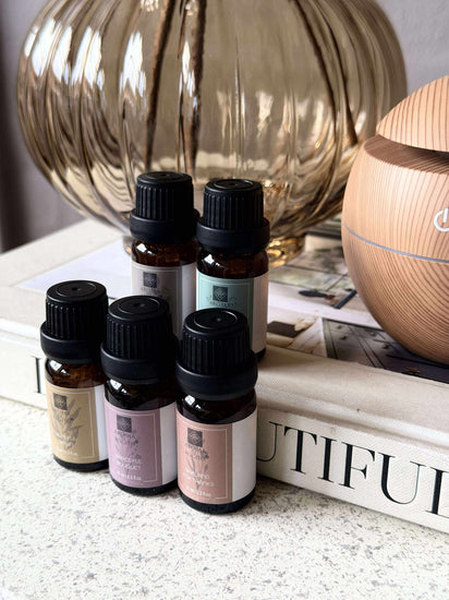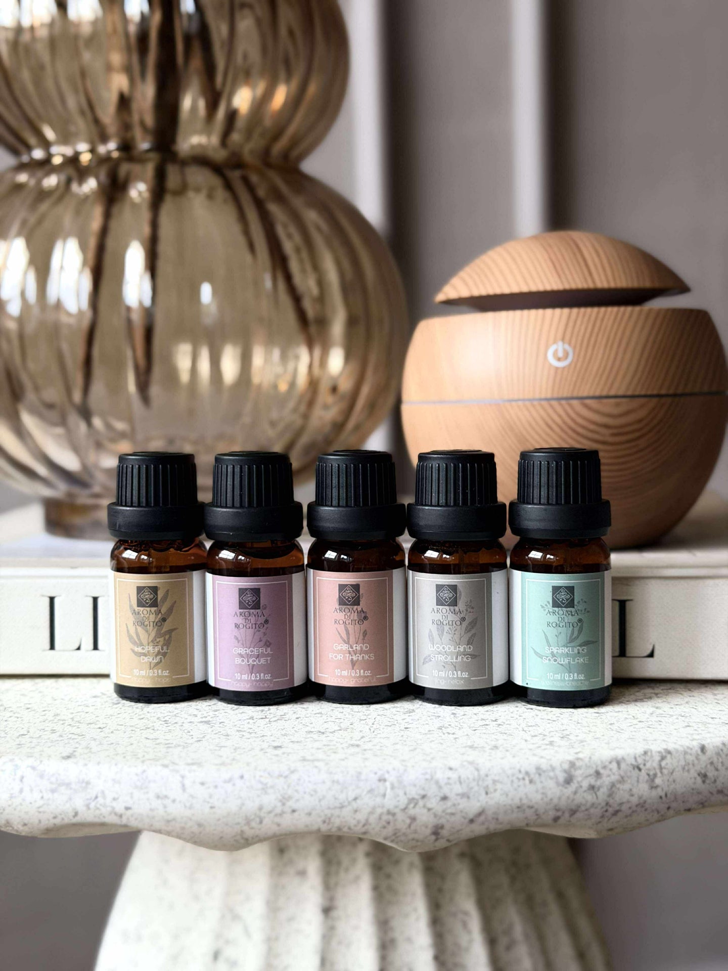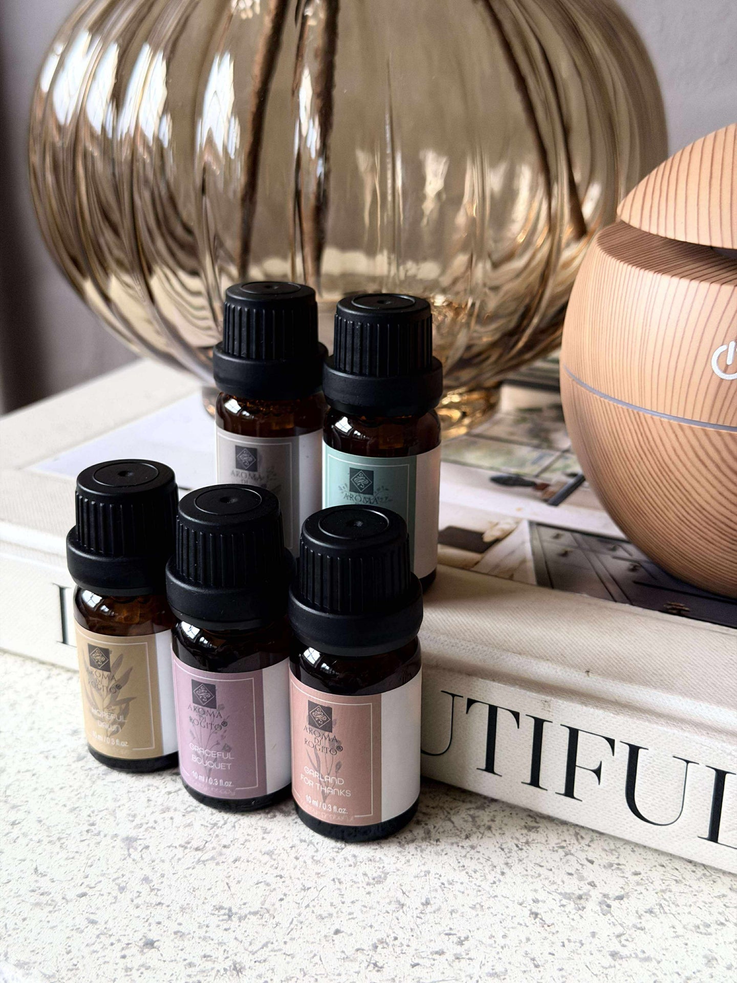 Aromadiffusorn levereras med 6 x 10 ml oljor, vilket ger en mångsidig doftupplevelse i ditt hem. Dessa oljor kan enkelt bytas ut för att passa ditt humör eller tillfälle, vilket skapar en anpassningsbar atmosfär. Genom att sprida oljorna i rummet hjälper diffusorn till att skapa en behaglig och avkopplande miljö, vilket påverkar både sinne och kropp positivt.