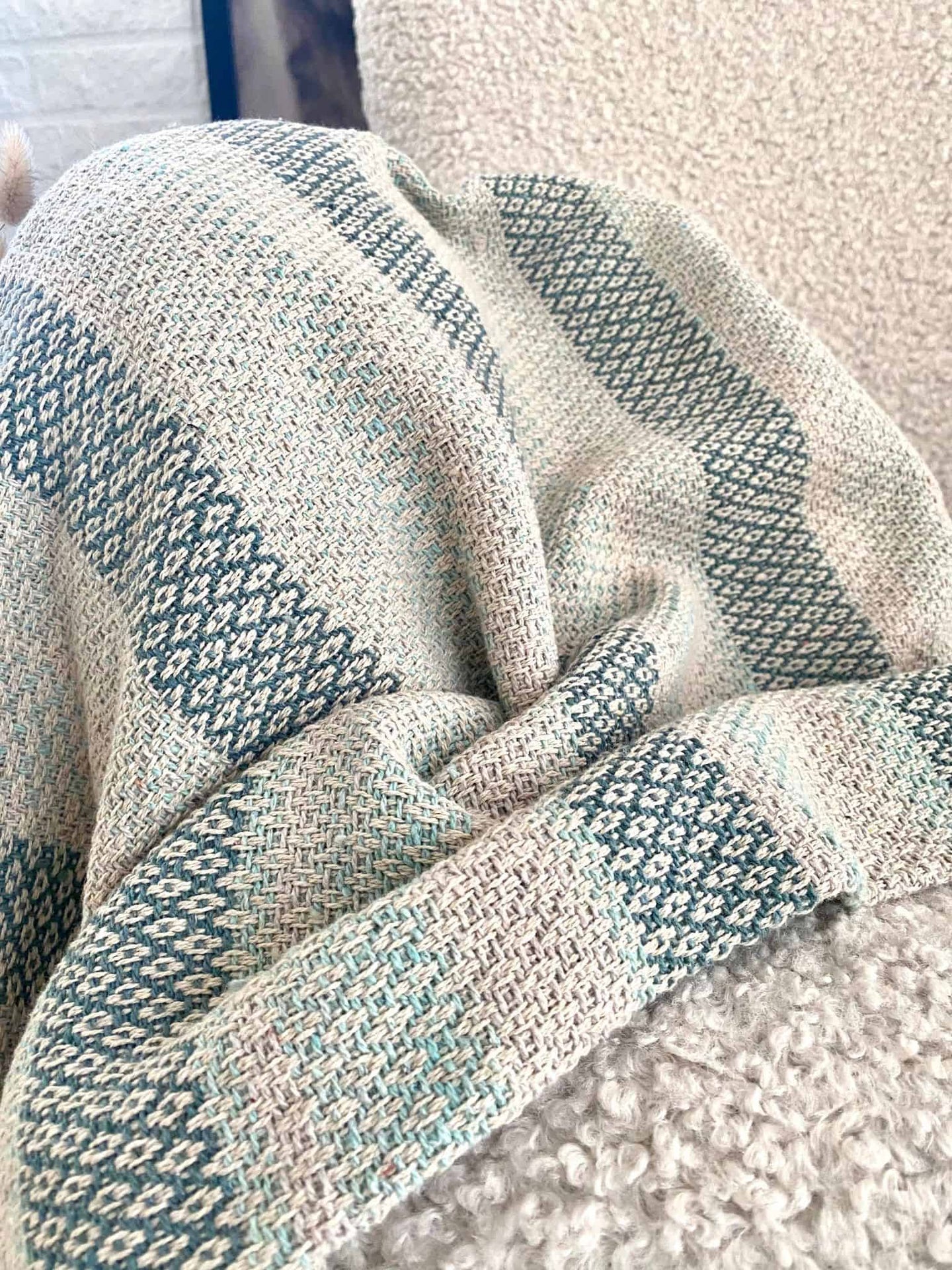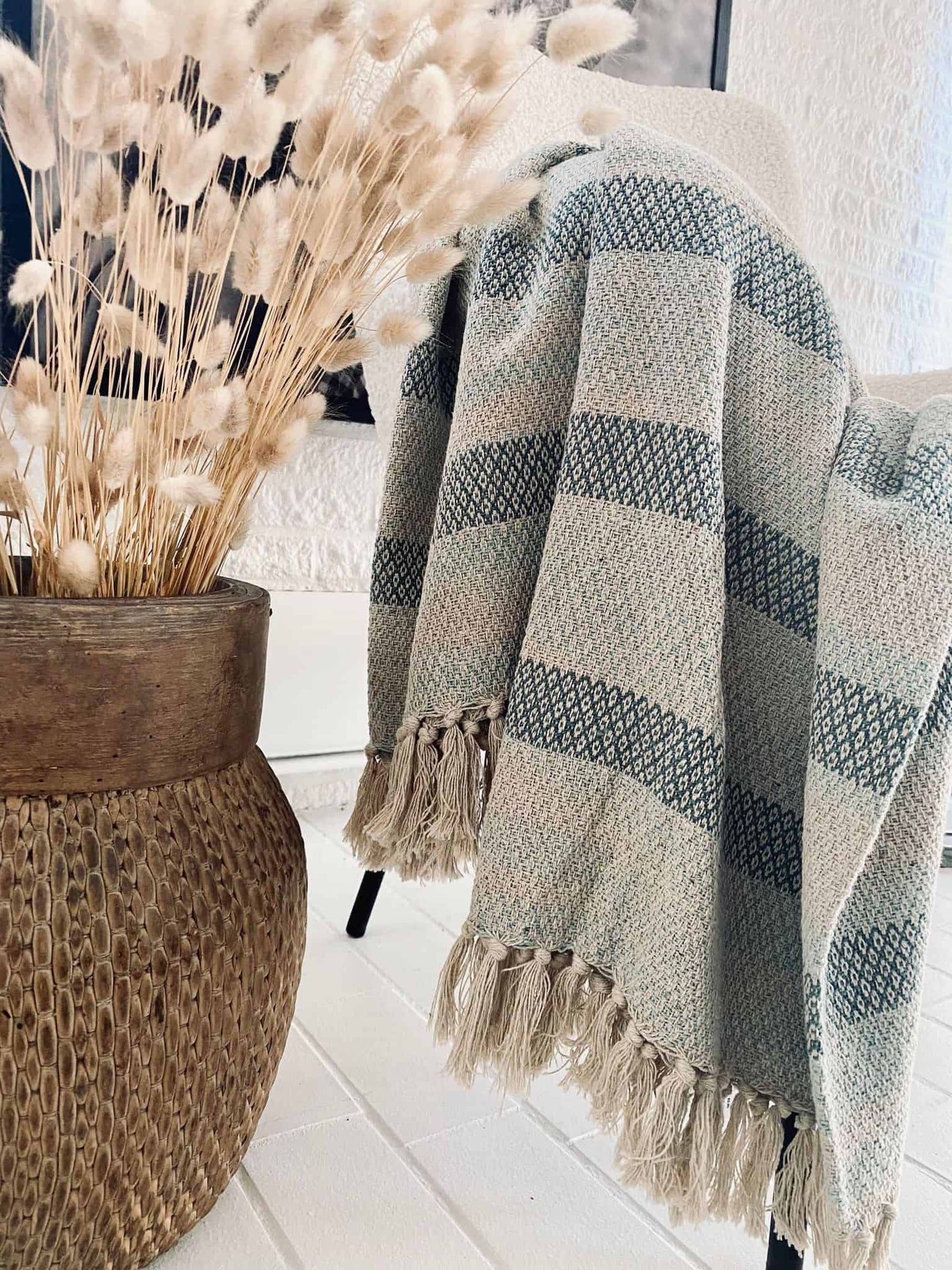 - Pläden med fransar är tillverkad av återvunnen bomull