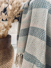 Detta återvunna bomullstäcke är inte bara mjukt och mysigt, utan också miljövänligt. Tillverkningen av återvunnen bomull minskar avsevärt mängden avfall och vattenanvändning jämfört med traditionell bomullsproduktion. Dessutom ger fransarna på täcket en charmig detalj som tillför en varm och inbjudande känsla till ditt hem.