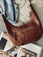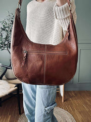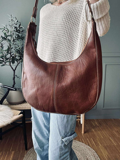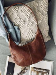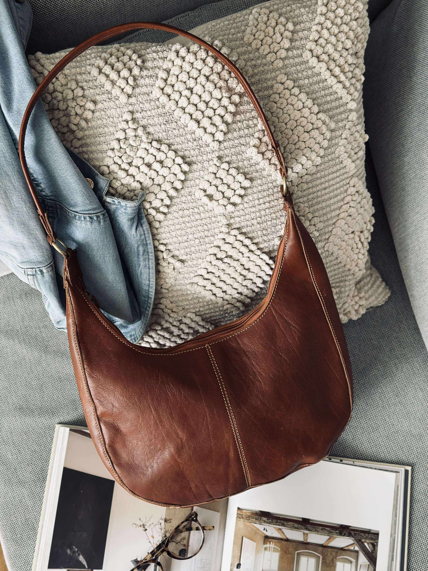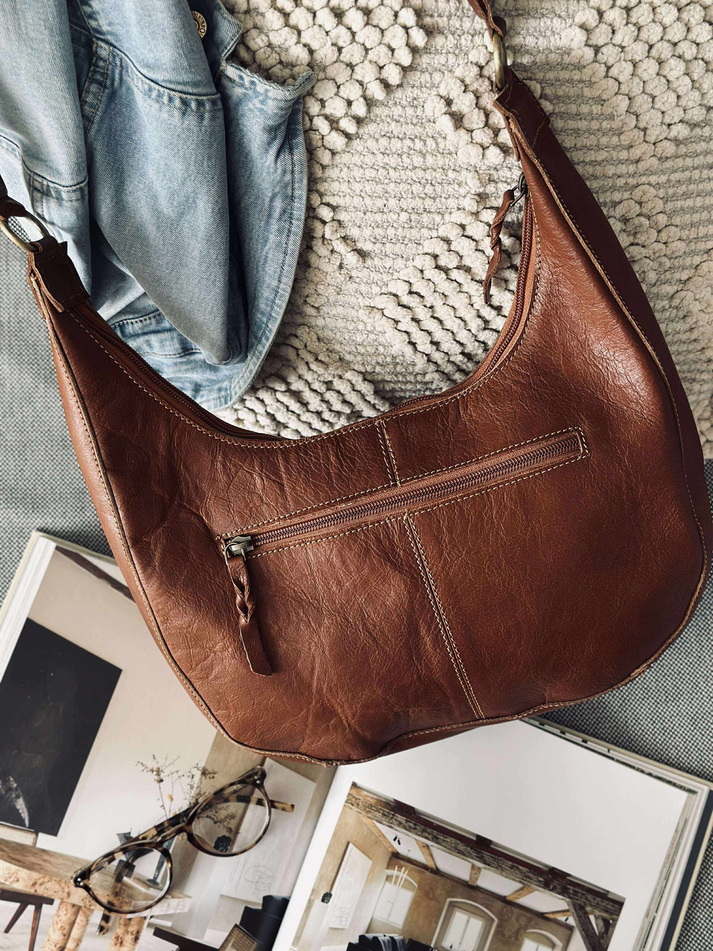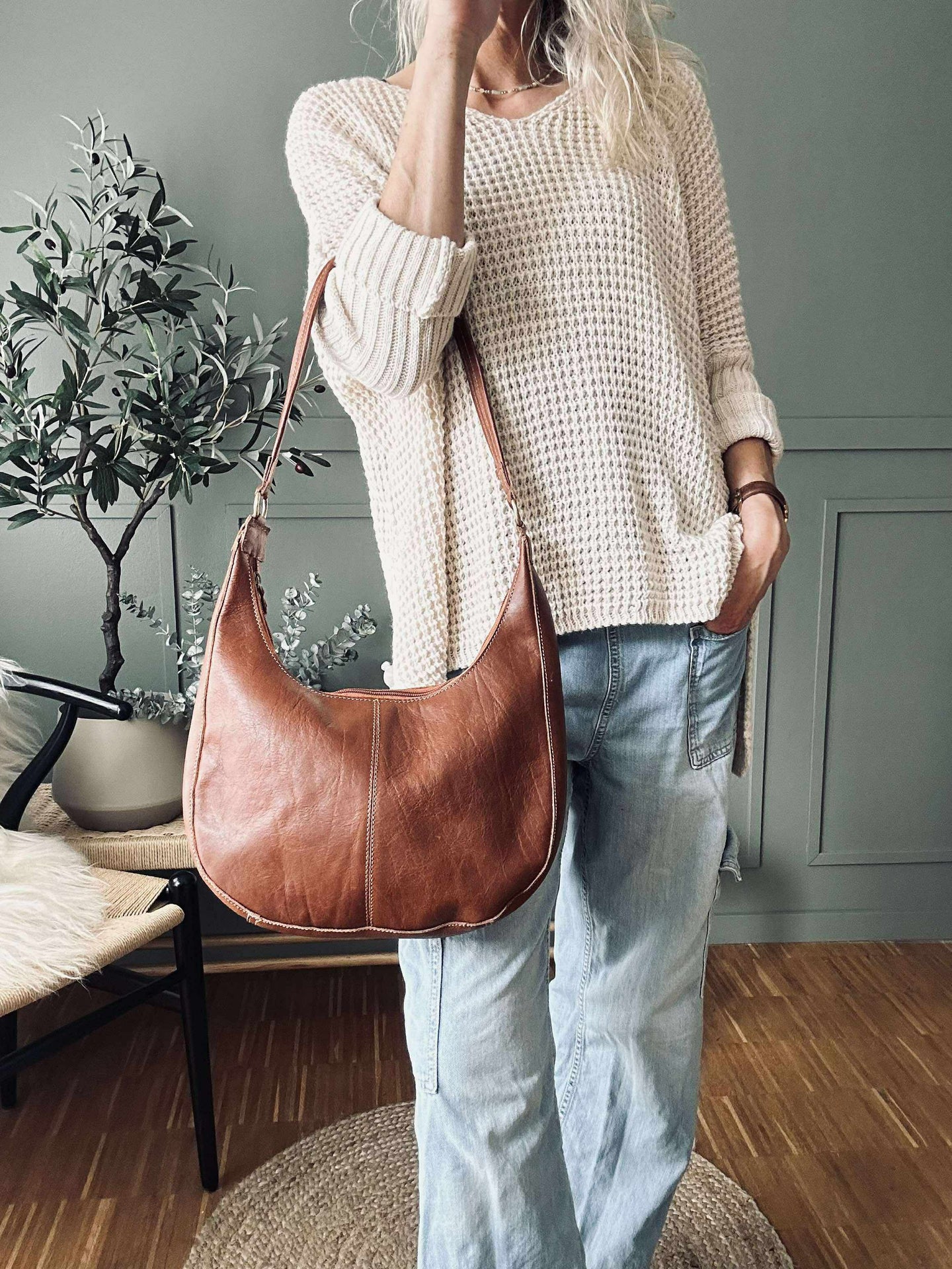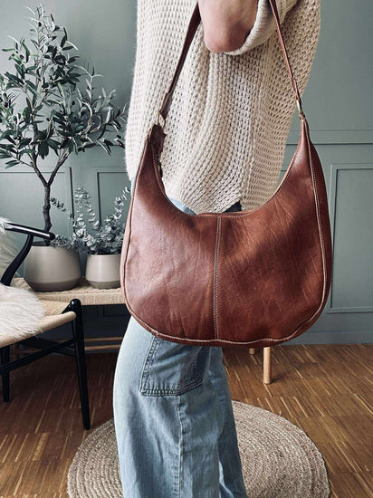 Axelväskan i läder är tillverkad av urban läder, ett naturligt målat oxläder med bevarat åremönster. Detta material ger väskan ett mjukt och slätt vintageutseende som samtidigt är hållbart och stilrent. Den lätta vaxningen förstärker lädrets mjukhet och ger en subtil glans, vilket gör väskan till ett tidlöst tillägg till din vardagsgarderob.