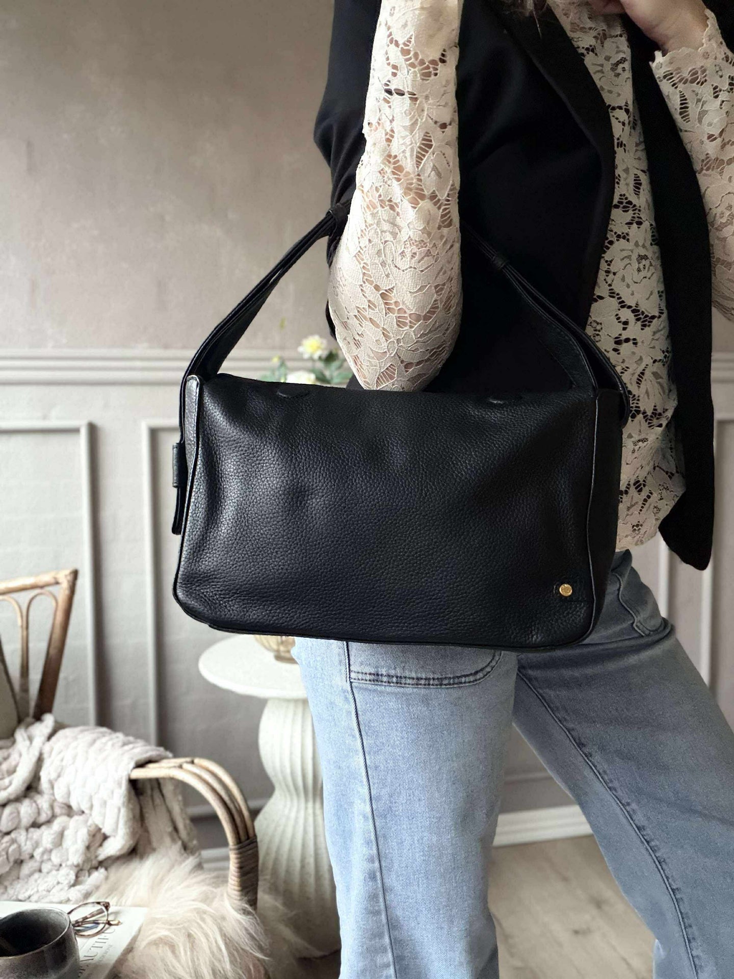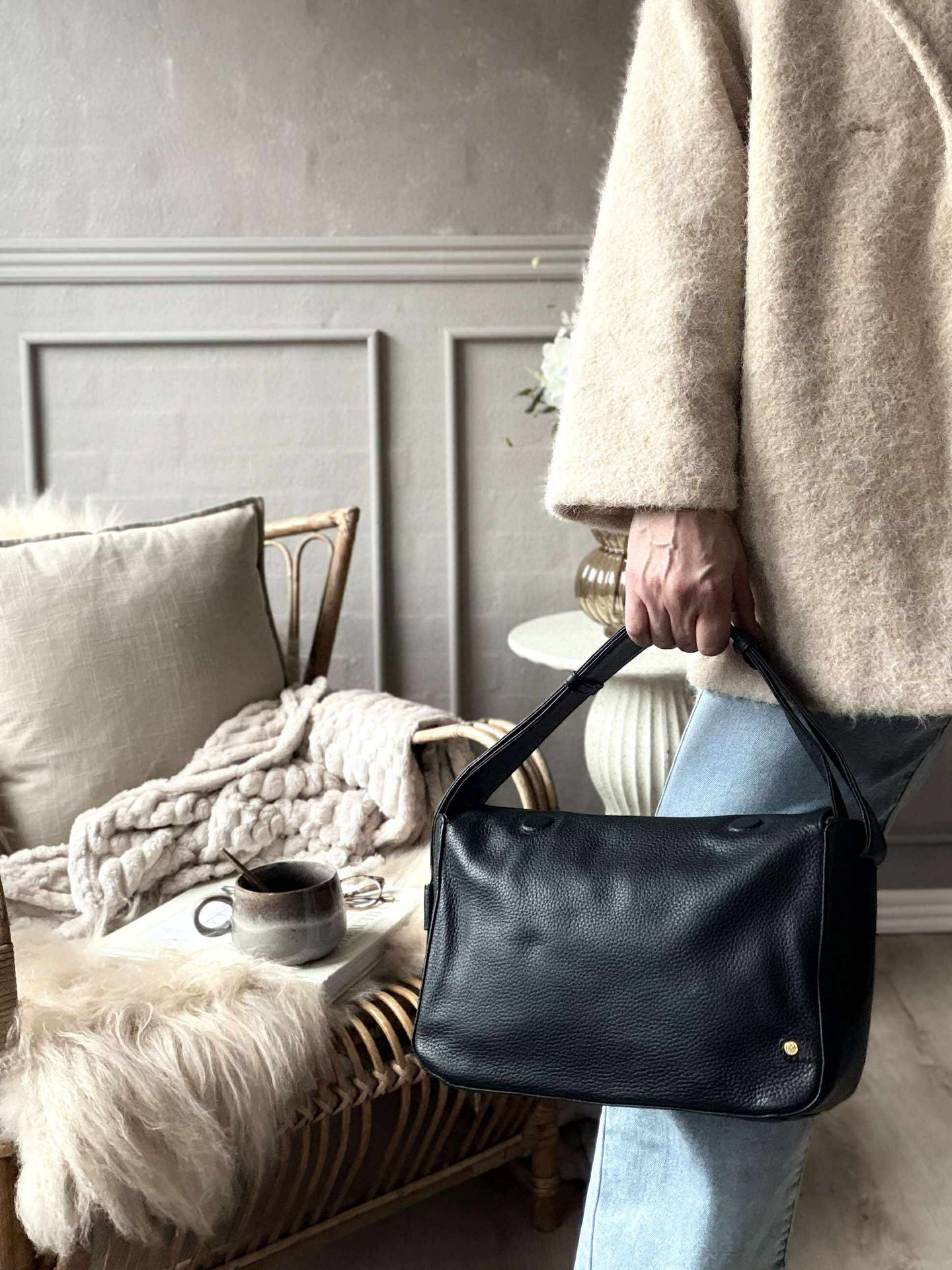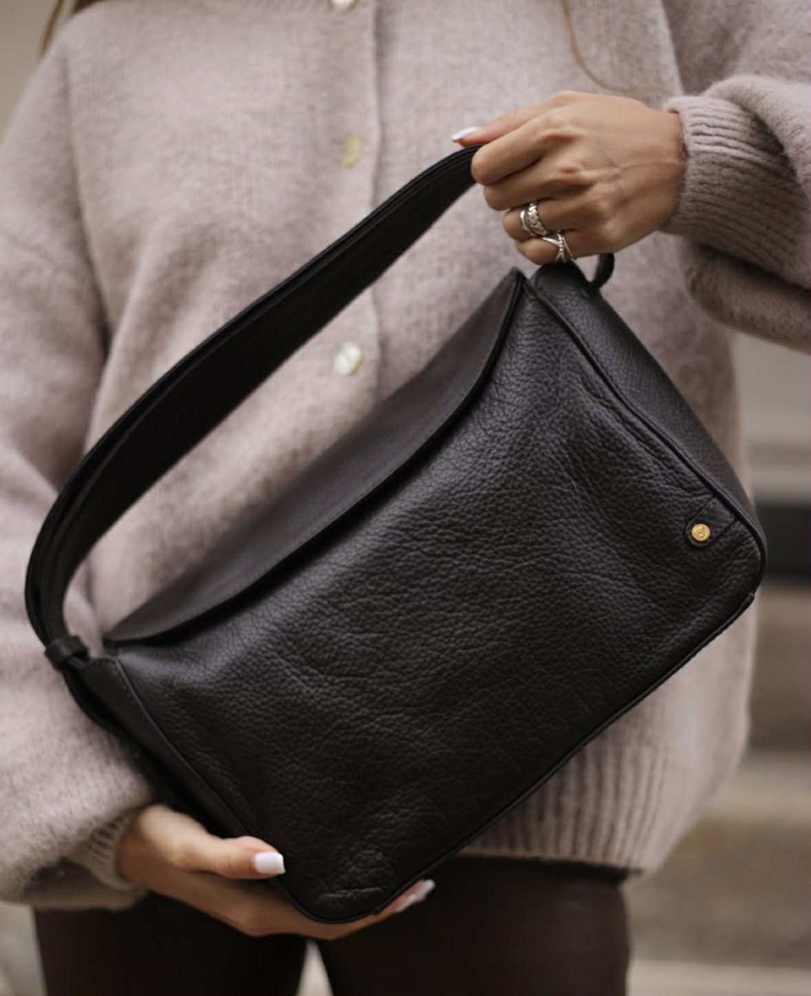 - De sista tre bilderna visar axelväskan i brunt för att ge en uppfattning om storleksförhållandet