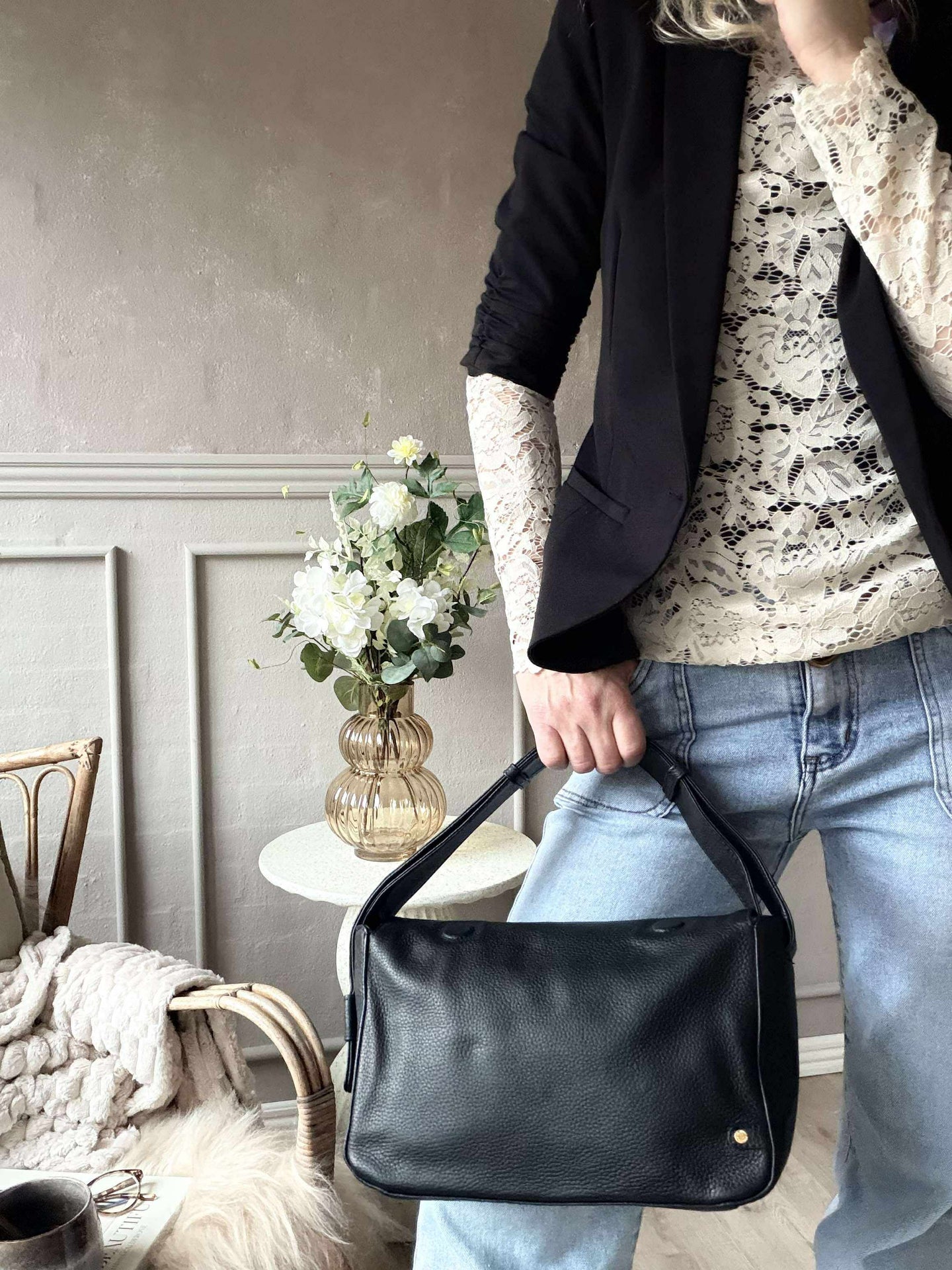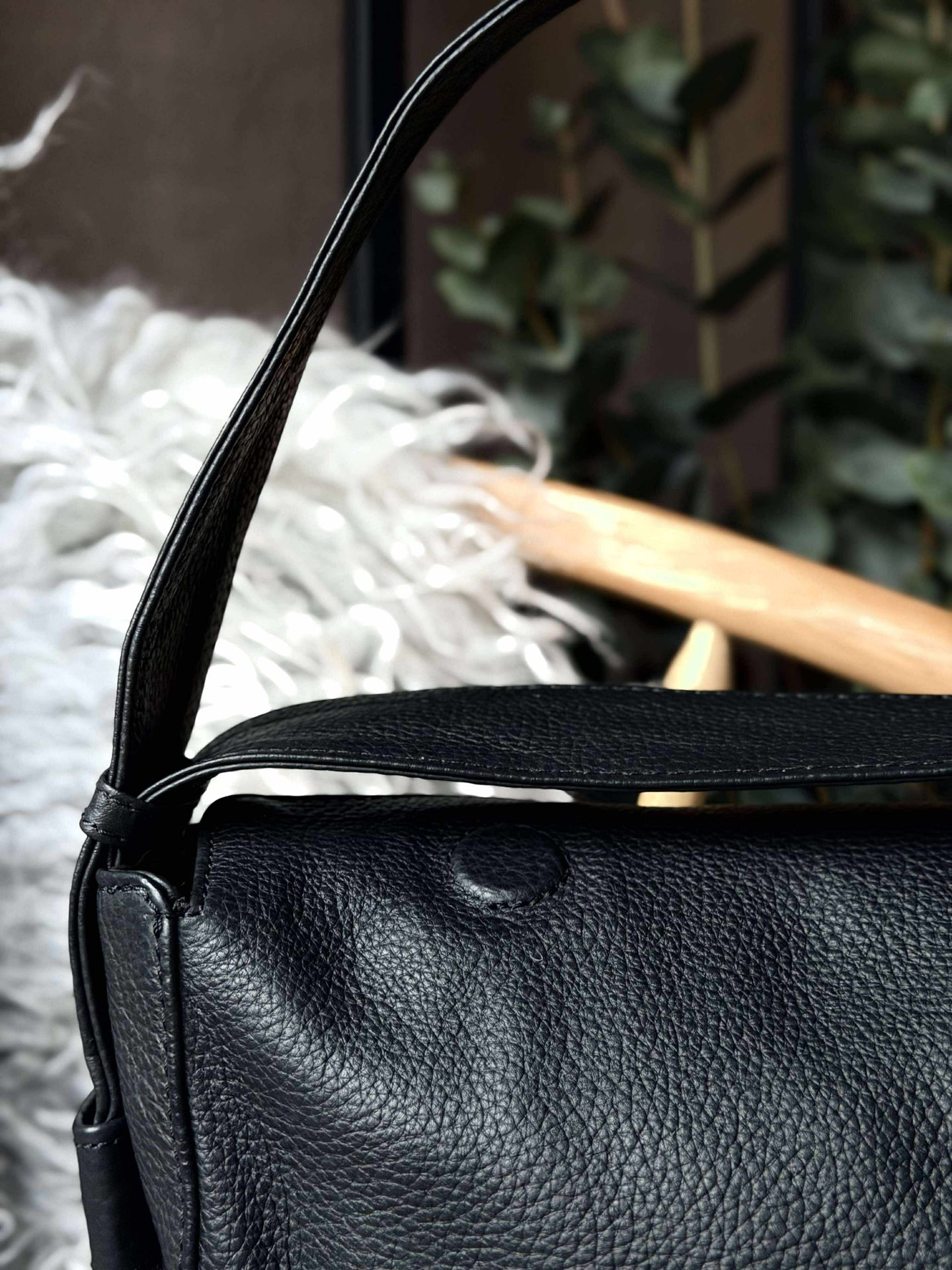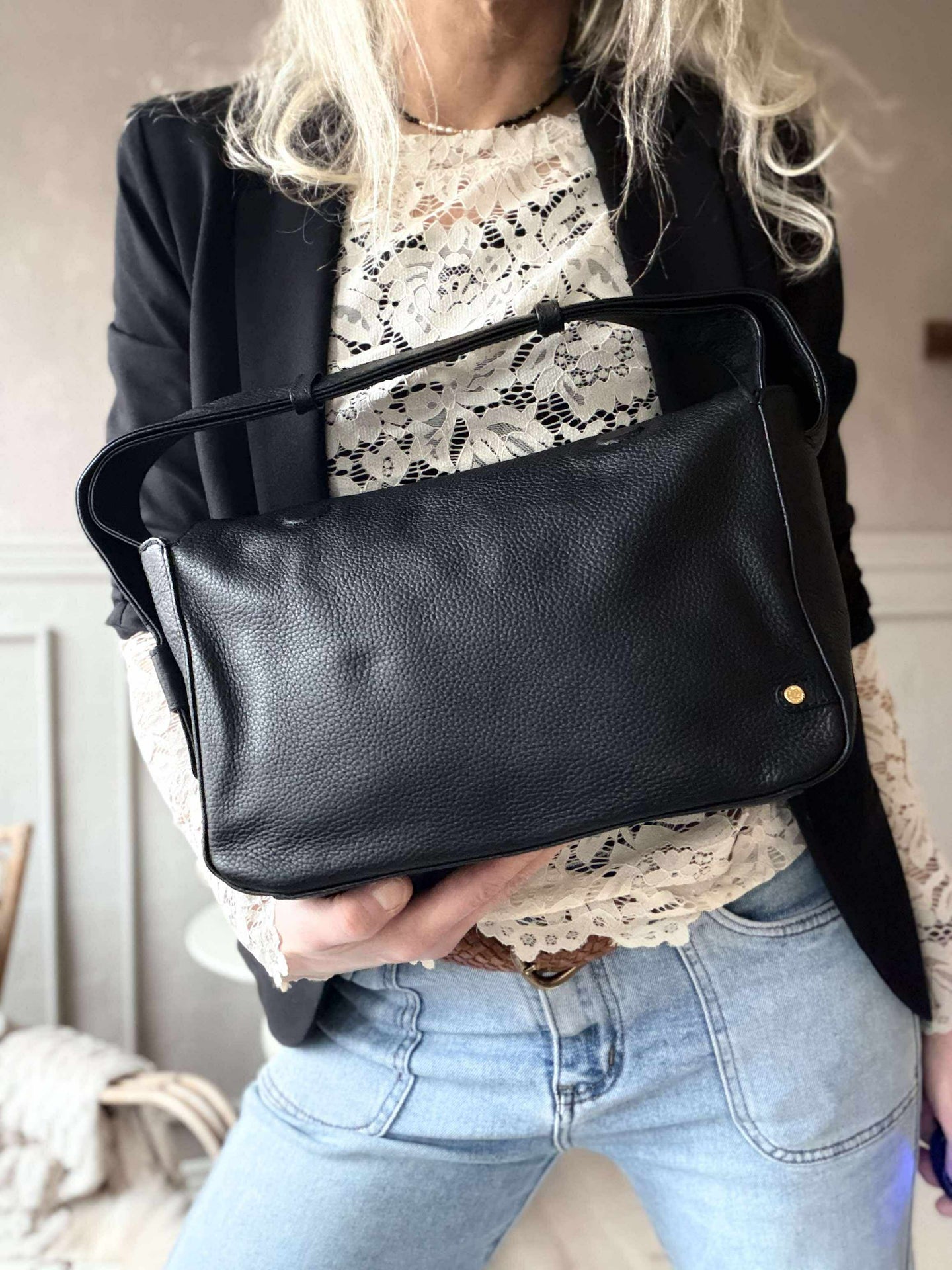 - De sista tre bilderna visar axelväskan i brunt för att ge en uppfattning om storleksförhållandet