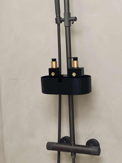 Denna badrumshylla i svart (badrumshylla svart) är en enkel lösning, när du vill samla dina badprodukter på ett ställe. Det enfärgade uttrycket gör hyllan lätt att matcha med resten av inredningen, och den passar bra där du vill ha mer ordning kring tvål och schampo.