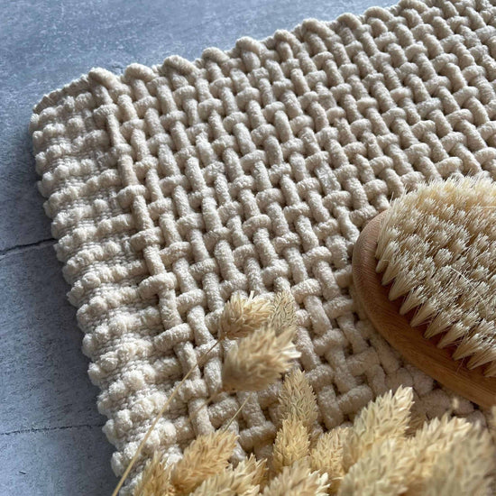 Denna badmatta är en kombination av funktionalitet och estetik. Mattan är mjuk, vilket gör att du känner dig bekväm när du står på den. Den är också vacker med sin naturliga färg och vävda struktur.