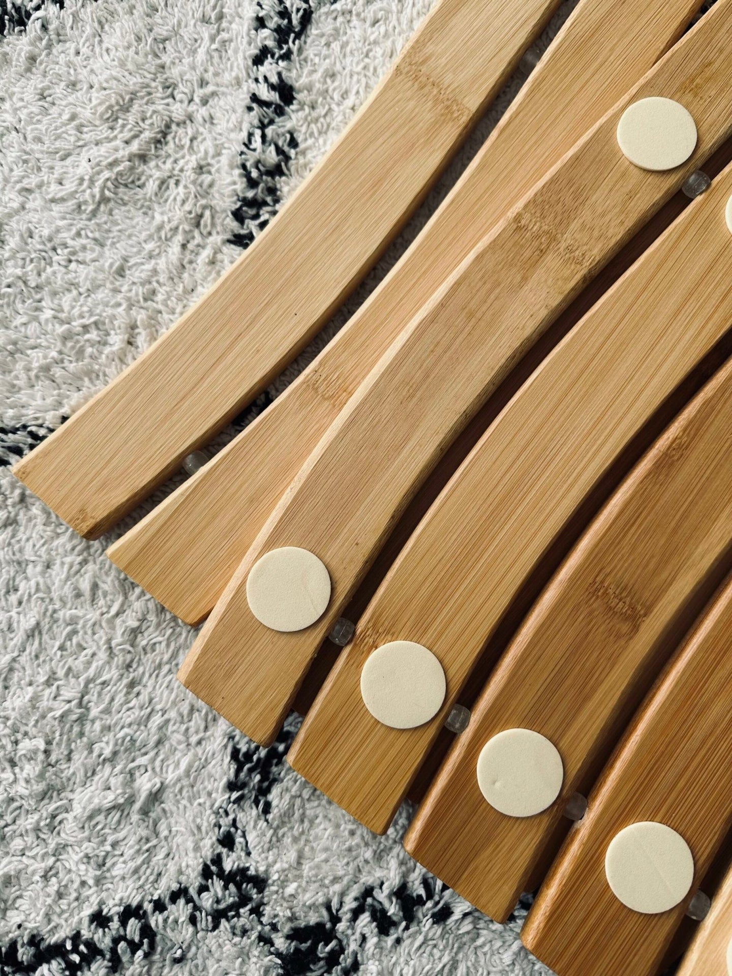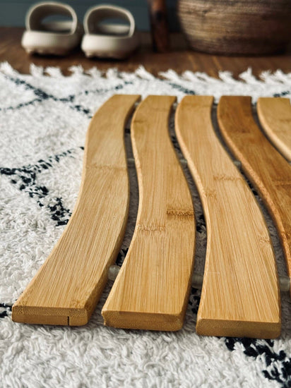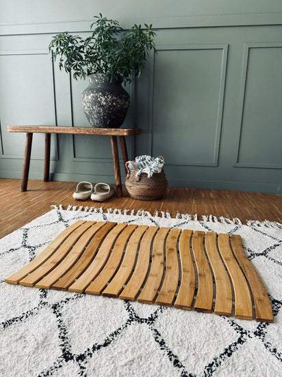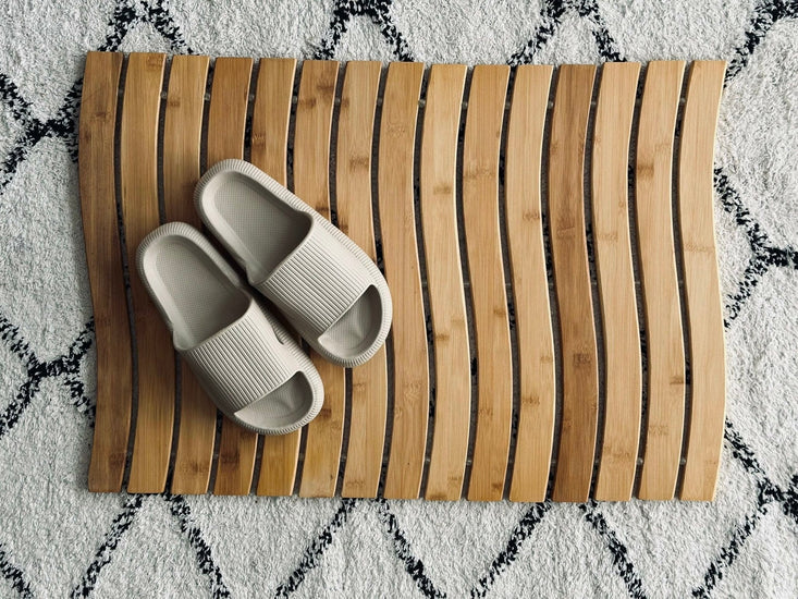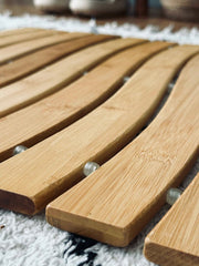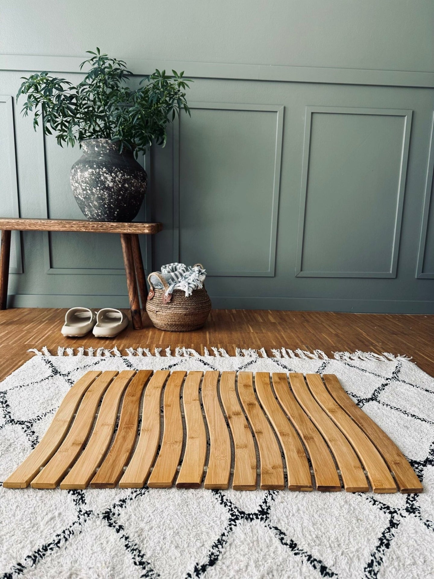Denna badrumsmatta är tillverkad av bambu, ett hållbart och miljövänligt material. Bambu är känt för sin förmåga att motstå fukt och repor, vilket gör mattan till ett utmärkt val för badrummet. Dessutom har bambu en naturlig skönhet som tillför en lugnande och avkopplande atmosfär till rummet. Med denna badrumsmatta kan du stiga ut ur duschen och direkt på en mjuk, varm yta.
