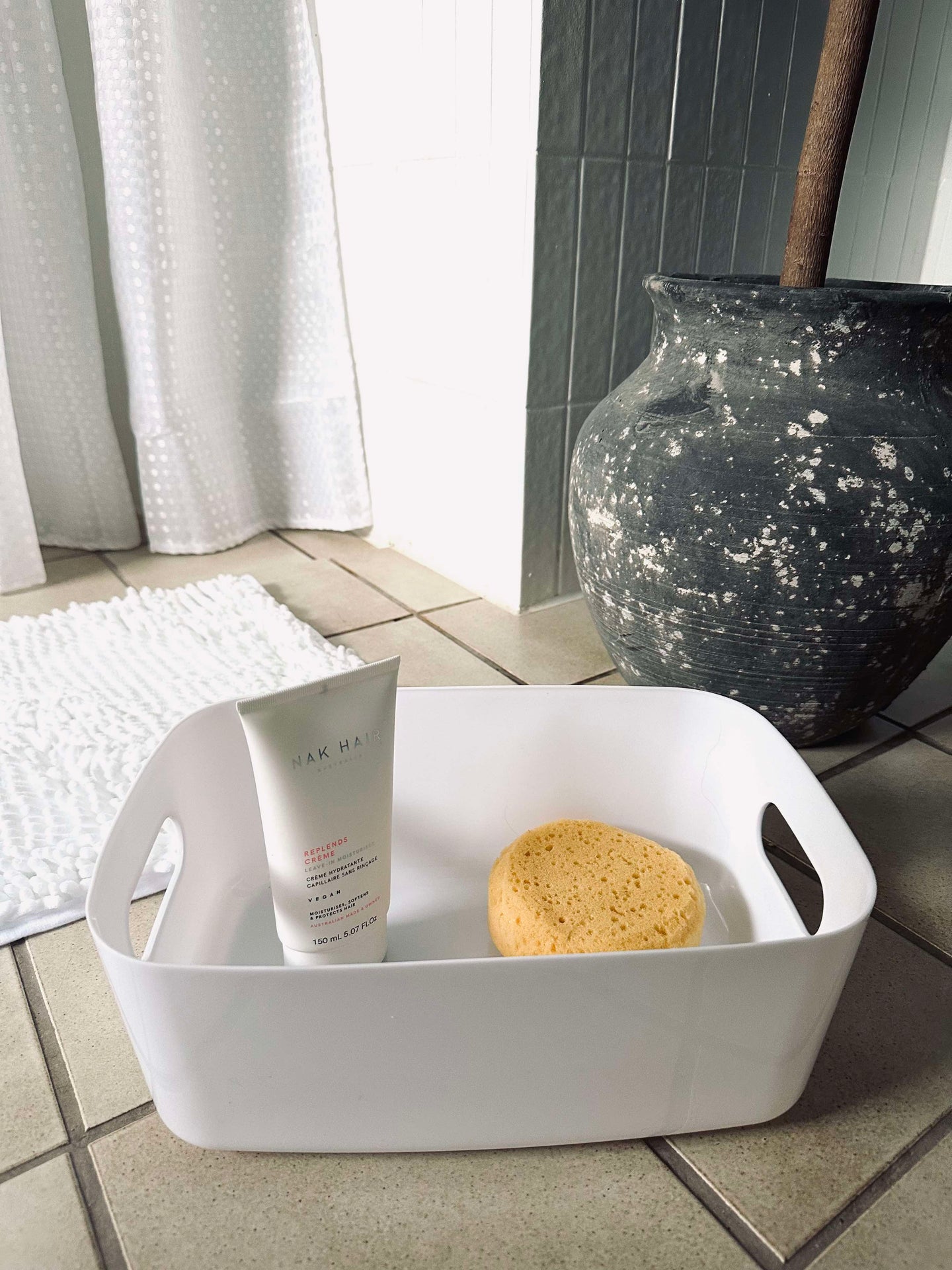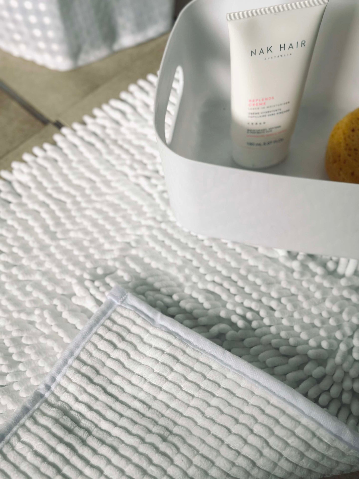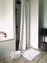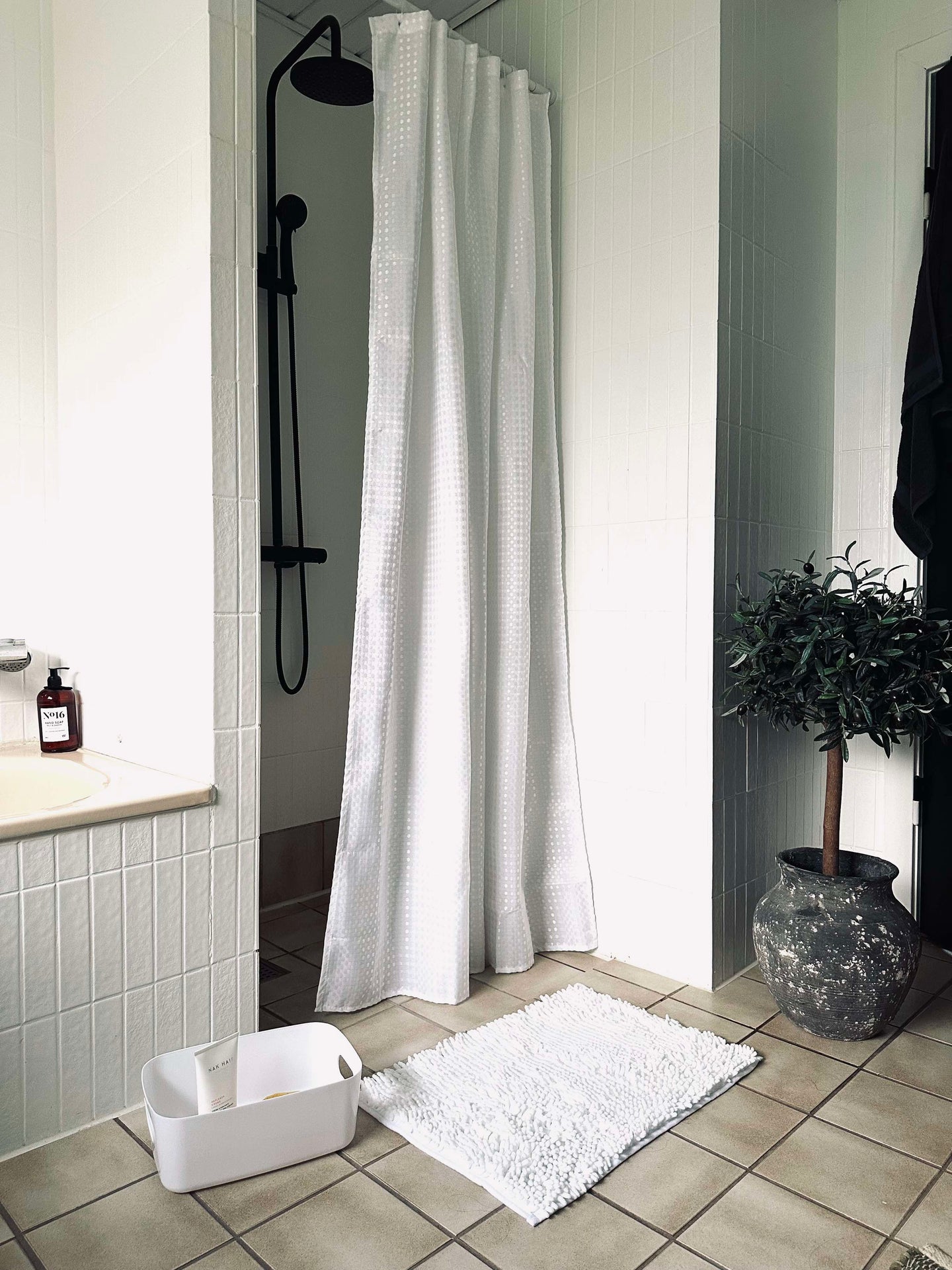 - Badrumssatsen innehåller duschdraperi, badmatta och förvaringslåda
