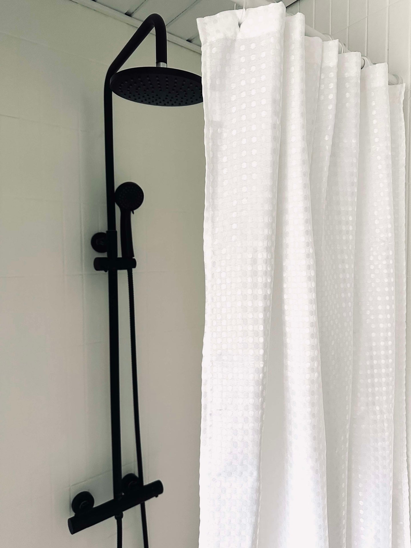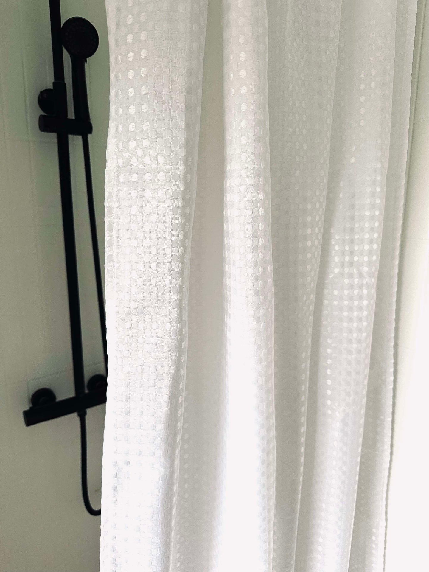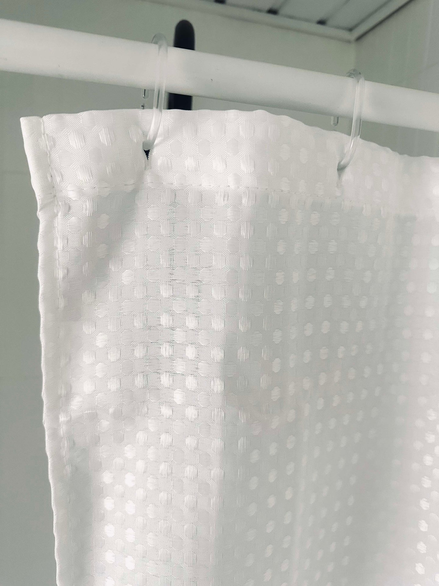 - Duschdraperiet är mögelbehandlat, och krokar för upphängning ingår