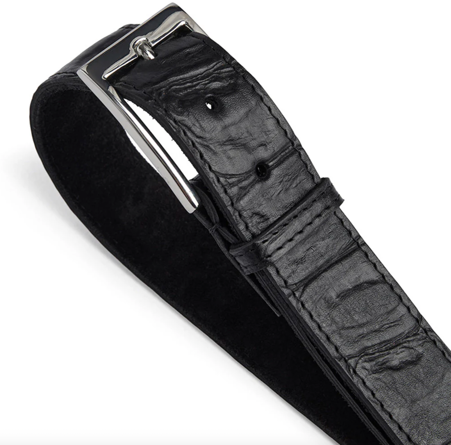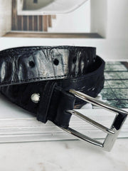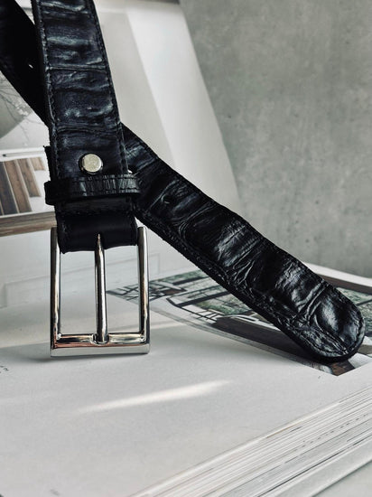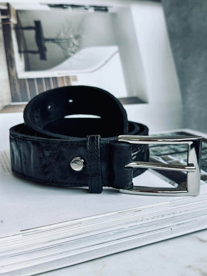 Tillverkat av 100 % kalvskinn med croco-prägling erbjuder detta bälte en hållbarhet som står emot tidens tand. Den noggrant utförda präglingen ger en subtil och sofistikerad textur som tillför en dimension av djup och karaktär. Kalvskinnets naturliga egenskaper ger en mjuk känsla mot huden, vilket gör bältet bekvämt att bära hela dagen.