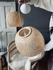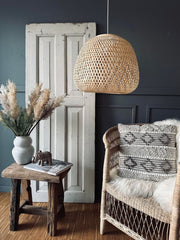 Vår bambulampa är tillverkad av noggrant flätad bambu, vilket ger den en unik och naturlig estetik. Detta material bidrar till att skapa en varm och inbjudande atmosfär i ditt hem, samtidigt som det ger en hållbar och miljövänlig belysningslösning. Den flätade bambustrukturen skapar dessutom ett vackert ljusspel när lampan är tänd.