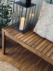 Akacia är ett material som är känt för sin hållbarhet och motståndskraft mot väder och vind, vilket gör det idealiskt för utomhusbruk. Träet har en naturlig skönhet med sina varma toner och distinkta ådringar, vilket ger bänken en tidlös estetik. Akacia kräver minimalt underhåll och behåller sin styrka över tid, vilket gör det till ett praktiskt och långvarigt val för utomhusmöbler.