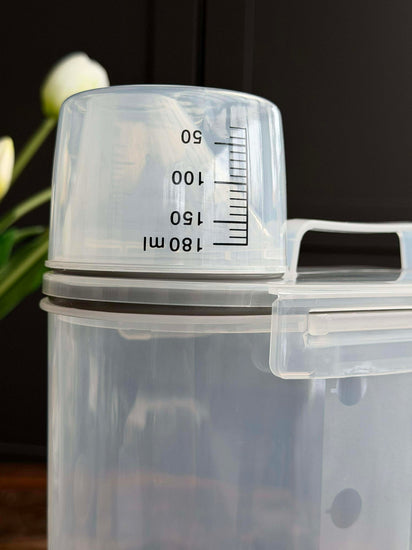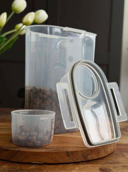 Behållaren är utformad för torrfoder och levereras med en måttbägare, så att du kan dosera enklare vid servering.