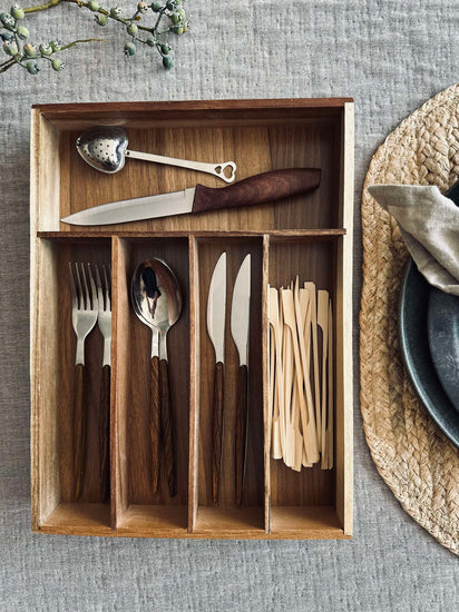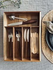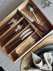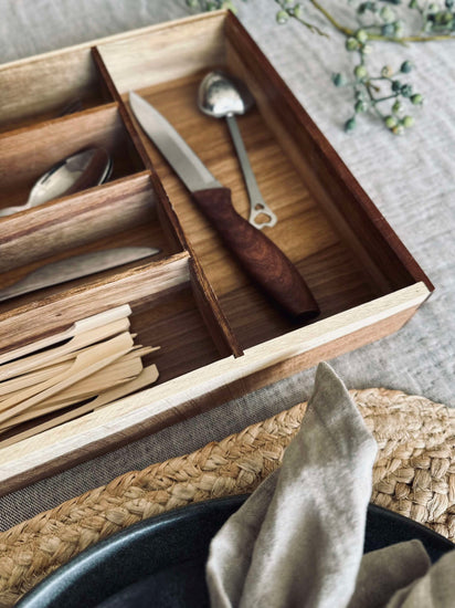Denna besticklåda, tillverkad av äkta akacieträ, erbjuder en naturlig och hållbar lösning för ditt kök. Akacieträet ger en robust struktur som säkerställer långvarig användning, samtidigt som det tillför en varm och inbjudande estetik. Materialets naturliga variationer i färg och ådring skapar en distinkt karaktär, vilket gör varje låda speciell och bidrar till en harmonisk köksmiljö.