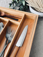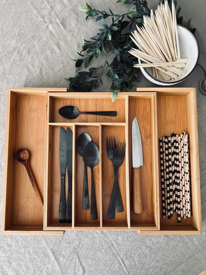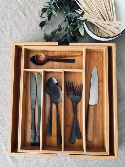 Vår besticklåda är justerbar för enkel anpassning till din lådstorlek. Det innebär att du enkelt kan anpassa besticklådan efter dina behov och skapa ett organiserat och effektivt kök. Den justerbara funktionen gör att du kan maximera utrymmet i din låda, vilket gör det lättare att hitta och förvara dina bestick.