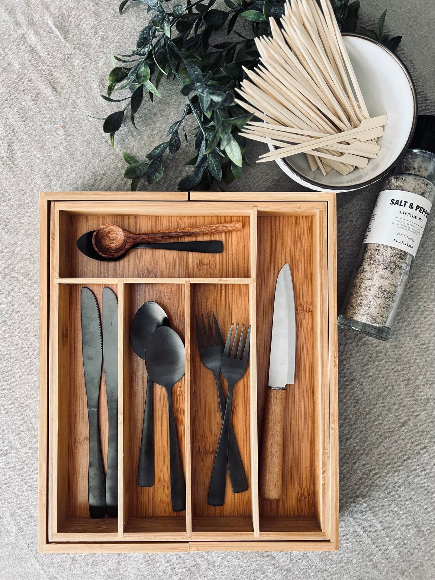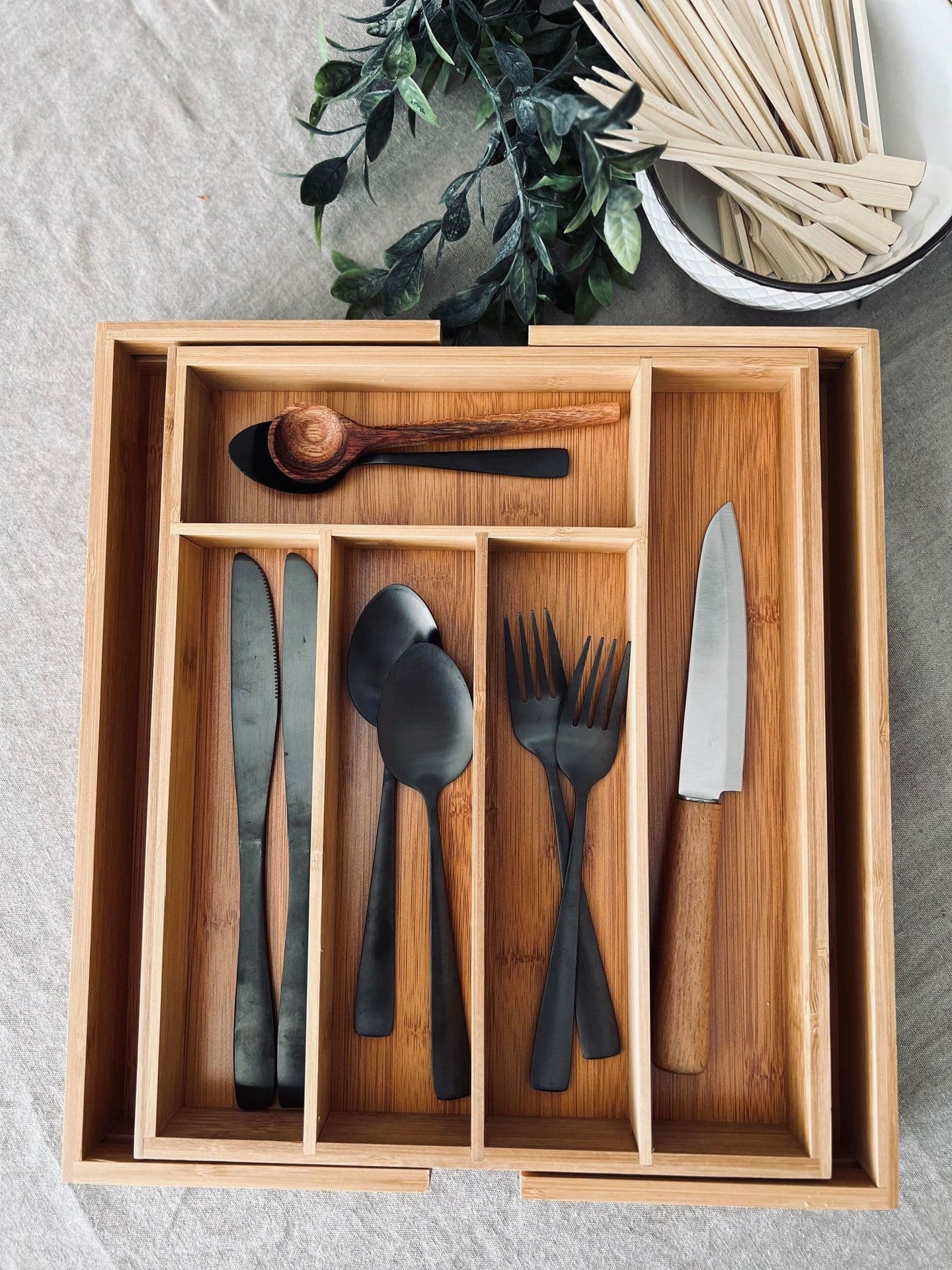 Har du någonsin önskat en mer organiserad och anpassningsbar lösning för dina köksbestick? Denna justerbara besticklåda i trä ger dig kontroll över din köksorganisation, vilket gör det enklare att hitta vad du behöver när du behöver det.