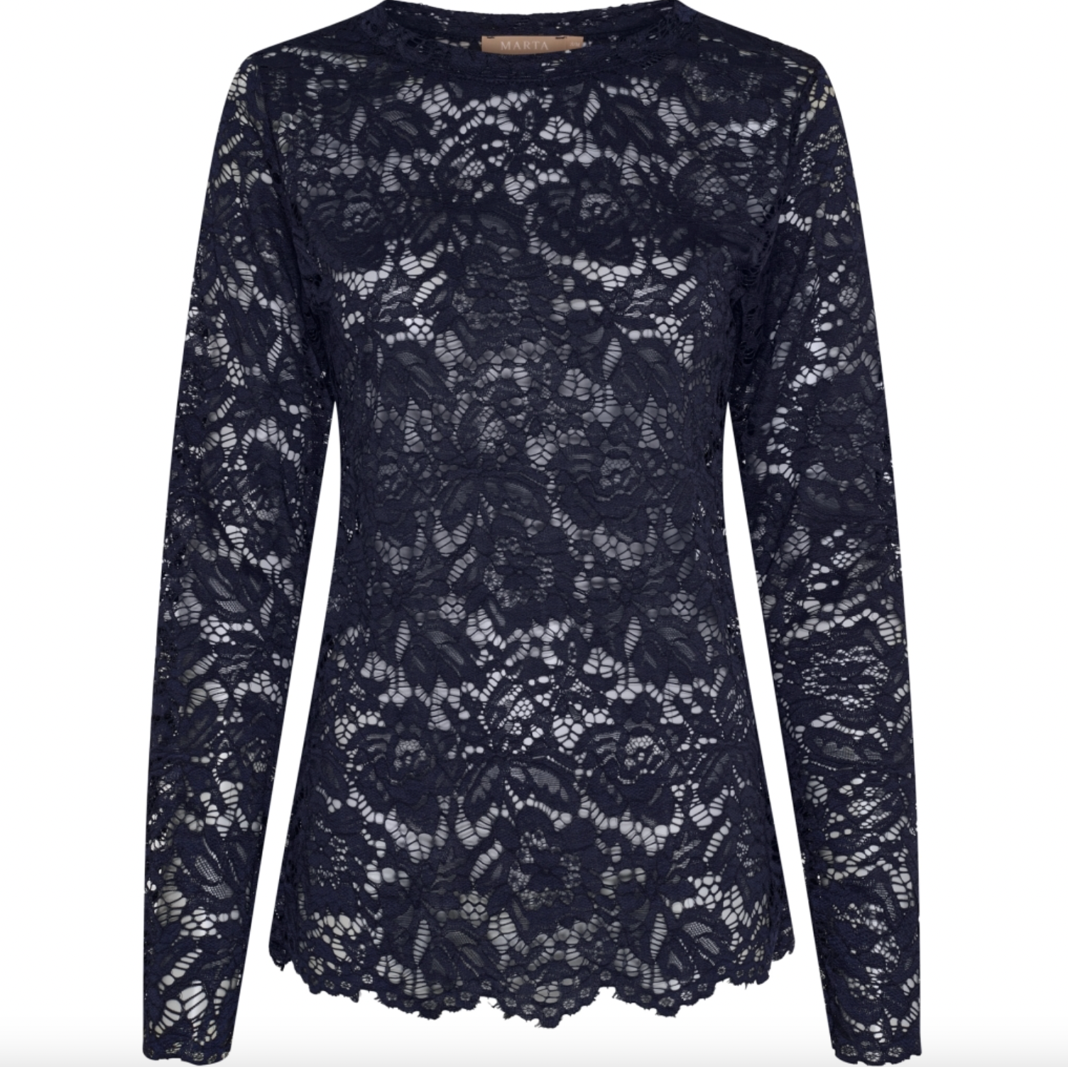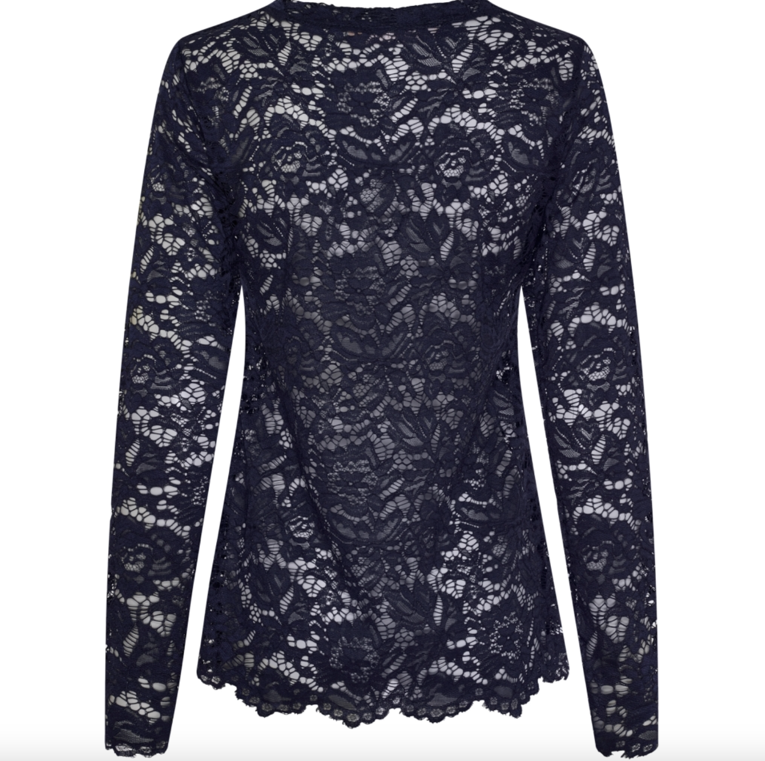 Blus - Milley navy är en elegant blå spetsblus med långärmar och rund hals. Den har en slim passform som ger ett raffinerat uttryck, och det blommiga mönstret tillför en feminin look som fungerar lika bra till vardags som vid mer uppklädda tillfällen.