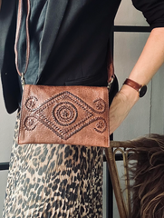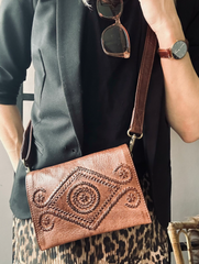 Elevate din stil med Boheme Brandy Handgjord koppling. Denna kalvskinns koppling erbjuder en idealisk lösning för att bära dina dagliga nödvändigheter med en unik bohemisk touch. Med möjlighet att förvandlas för extra komfort, gör den varje outfit distinkt.