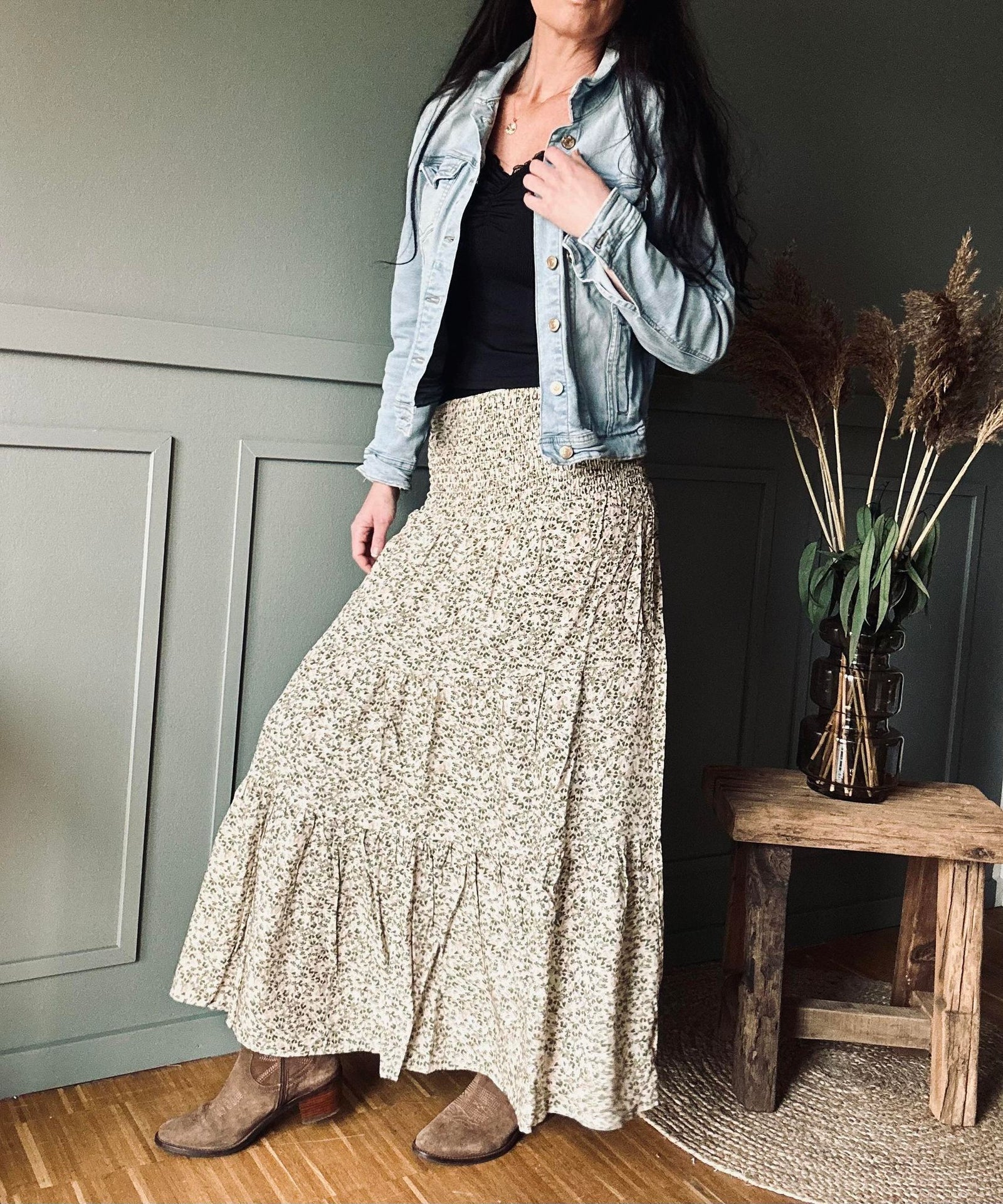 Denna bohemiska kjol är tillverkad av 100% viskos, ett material känt för sin mjukhet och lätthet. Viskos har förmågan att andas vilket gör kjolen bekväm att bära under varma sommardagar. Dessutom är viskos hållbart och biologiskt nedbrytbart, vilket bidrar till en mer hållbar livsstil. Kjolens design och materialval gör den till ett mångsidigt plagg som passar till många olika tillfällen.