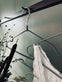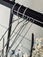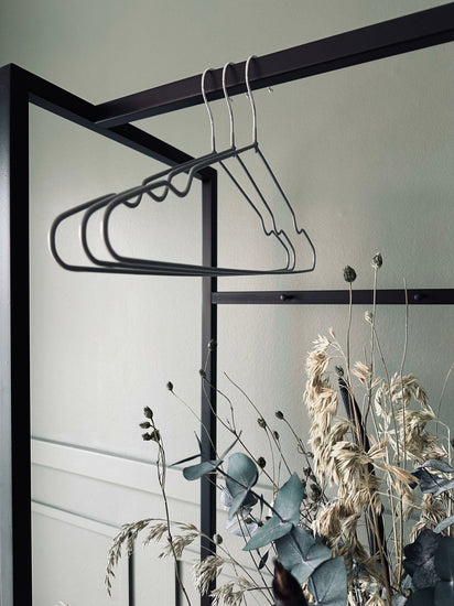 Detta är ett set av tre metallgalgar med en snygg grå färg. Dessa galgar är perfekta för att hålla dina kläder organiserade och fria från skrynklor. De är tillverkade av högkvalitativ metall och har en slät, svart beläggning för extra hållbarhet.