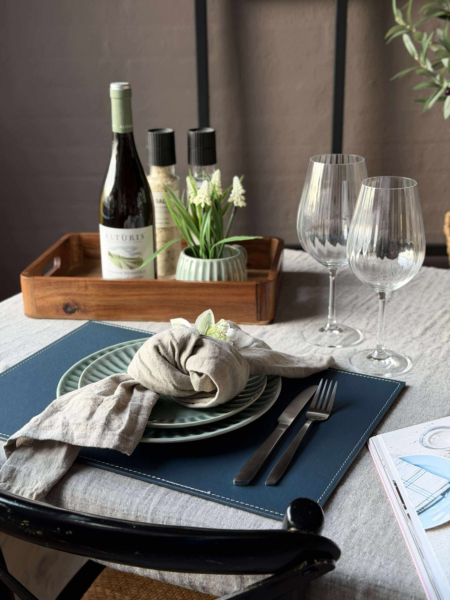 Däcksservetten är tillverkad av konstläder, vilket ger den en mjuk och behaglig känsla vid användning. Materialet är resistent mot fläckar och enkelt att rengöra, vilket gör den praktisk för dagligt bruk i köket. Dess hållbarhet säkerställer att servetten behåller sitt utseende över tid, samtidigt som den bidrar till en stilren och funktionell dukning.