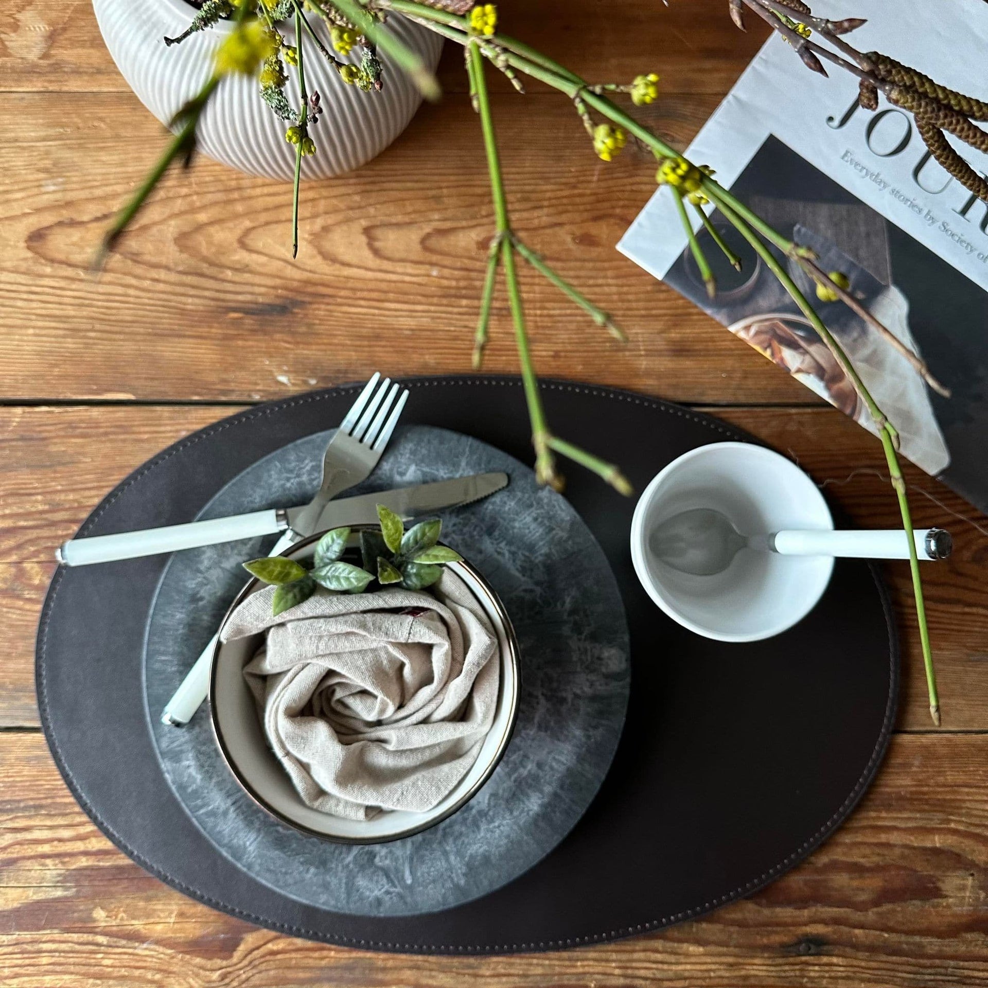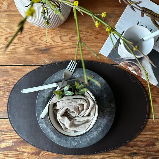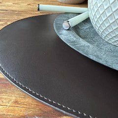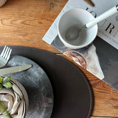 Låt ditt kök avspeglas med stil och funktionalitet. Vårt ovala bordsunderlägg i mörkbrun återvunnet läder gör att du kan njuta av dina måltider utan bekymmer om spill och fläckar, samtidigt som det ger en sofistikerad touch till ditt hem.