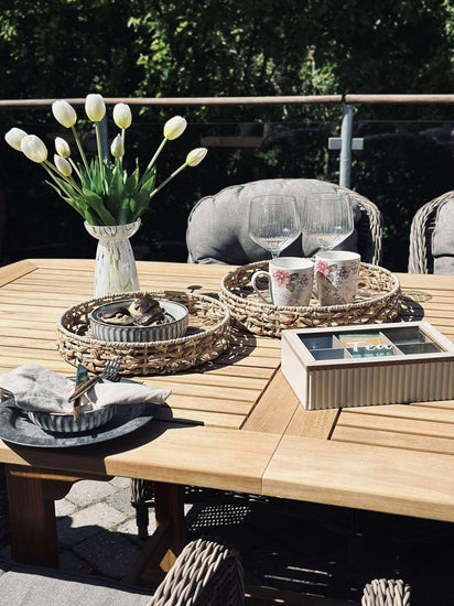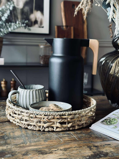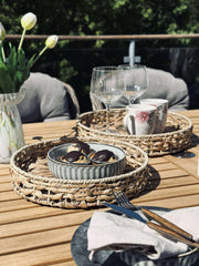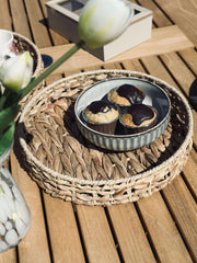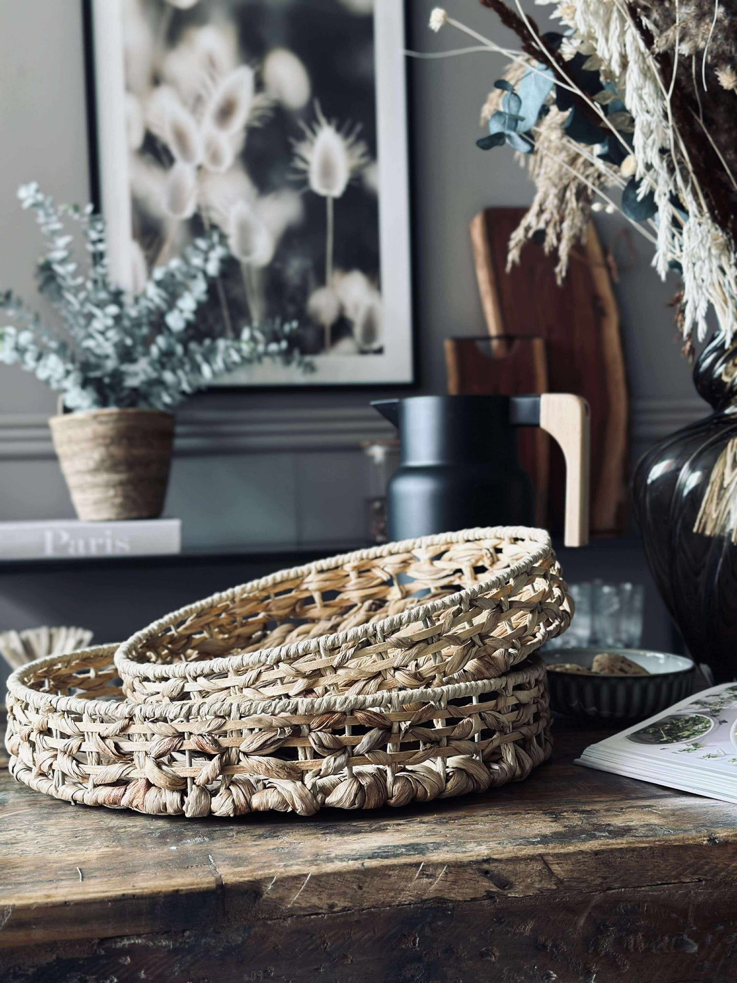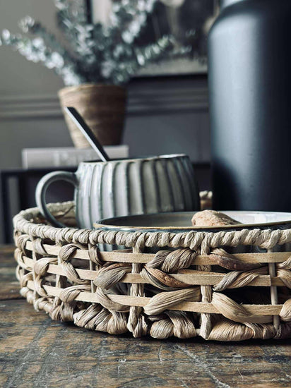 Brickan är gjord av äkta vattenhyacint, vilket ger den en naturlig känsla och ett unikt utseende. Materialet bidrar till en varm och inbjudande atmosfär i vilket rum den än placeras. Vattenhyacint är känt för sin hållbarhet och miljövänliga egenskaper, vilket gör denna bricka till ett medvetet val för dem som värdesätter både estetik och miljö.