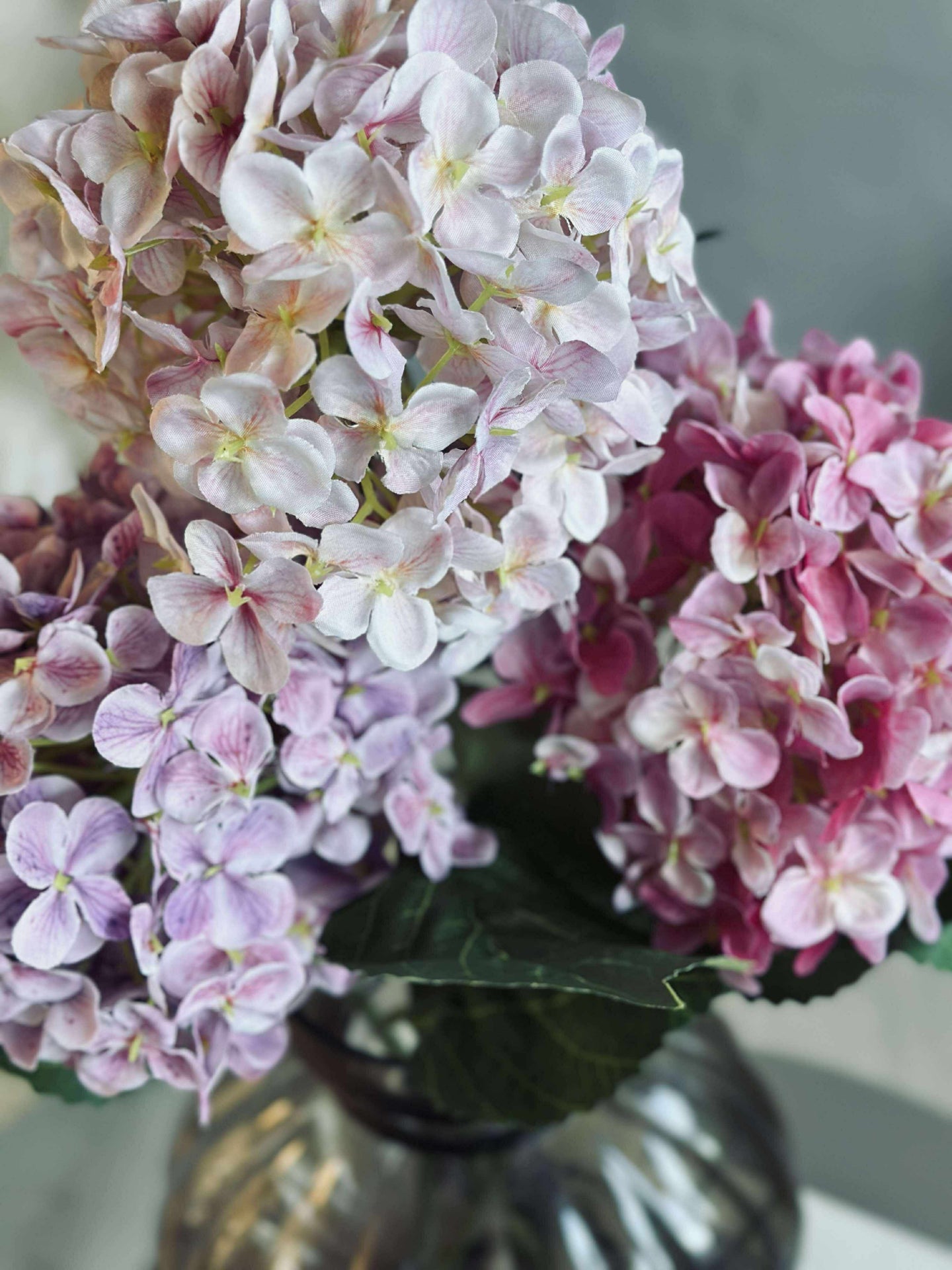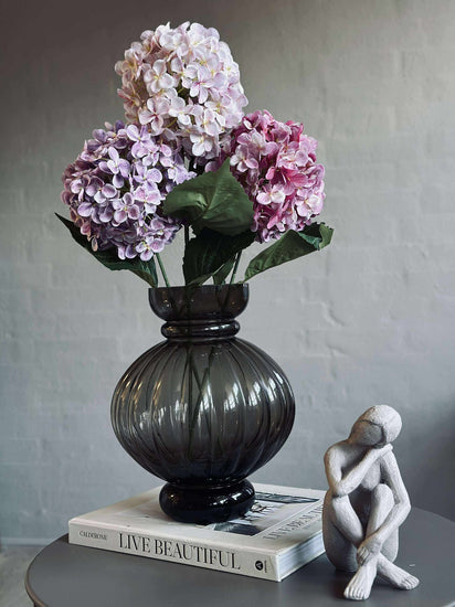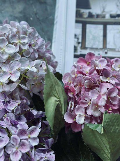 Dekorera med en hortensia bukett (hortensia buket) i rosa/lila nyanser, som ger ett fylligt, blommande uttryck – utan att du behöver tänka på vattning. Buketten är konstgjord och håller därför år efter år, så att du kan skapa samma stämning säsong efter säsong.