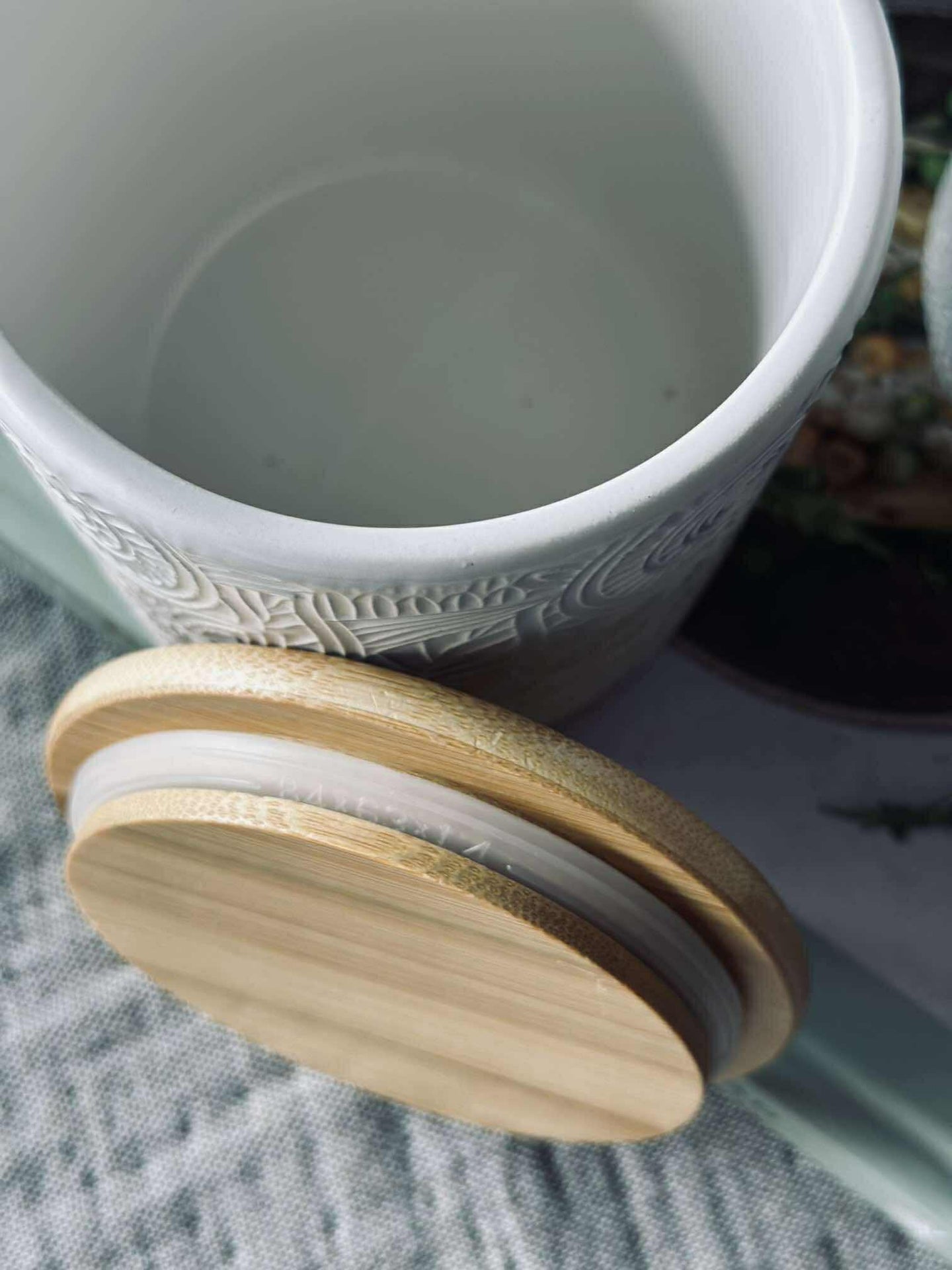 Locket, tillverkat av bambu, erbjuder en naturlig och hållbar lösning för att hålla innehållet i keramikkrukkan fräscht. Bambu är känt för sina antibakteriella egenskaper, vilket bidrar till att skydda mot oönskad lukt. Det lätta materialet gör det enkelt att hantera och passar smidigt på krukkans öppning, vilket säkerställer att maten eller ingredienserna förvaras säkert.
