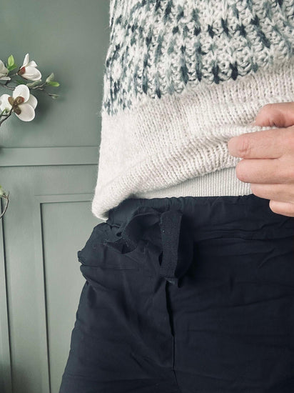 Byxor med snörning är tillverkade av en materialblandning som innehåller 65 % viskos, 30 % nylon och 5 % elastan. Denna kombination erbjuder en skön känsla mot huden, god hållbarhet och en viss stretch som ger en flexibel passform. Viskos bidrar till mjukhet och andningsförmåga, medan nylon ökar slitstyrkan. Elastan ger den nödvändiga elasticiteten för rörelsefrihet.
