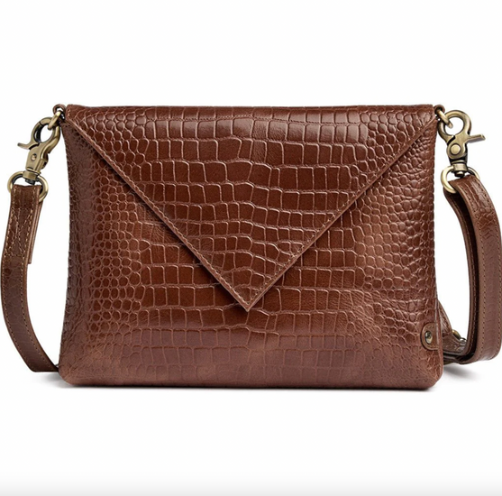 Denna läderclutch, tillverkad av 100 % äkta skinn med croco-print, erbjuder en kombination av hållbarhet och stil. Det robusta materialet säkerställer långvarig användning, medan croco-mönstret ger en sofistikerad textur och en visuell dimension. Skinnets naturliga egenskaper innebär att varje clutch har en individuell karaktär, vilket gör den till ett tidlöst tillägg till din samling.