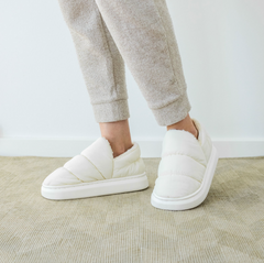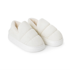 - Hjemmeskoen har en ljus cremefärg