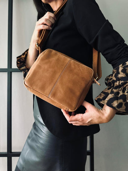 Nola Cognac crossbody-väskan är ditt svar på eleganta resor. En tidlös kompanjon som kompletterar din stil samtidigt som den håller dina nödvändigheter organiserade och till hands. En idealisk investering för den medvetna och stiliga livsstilälskaren.