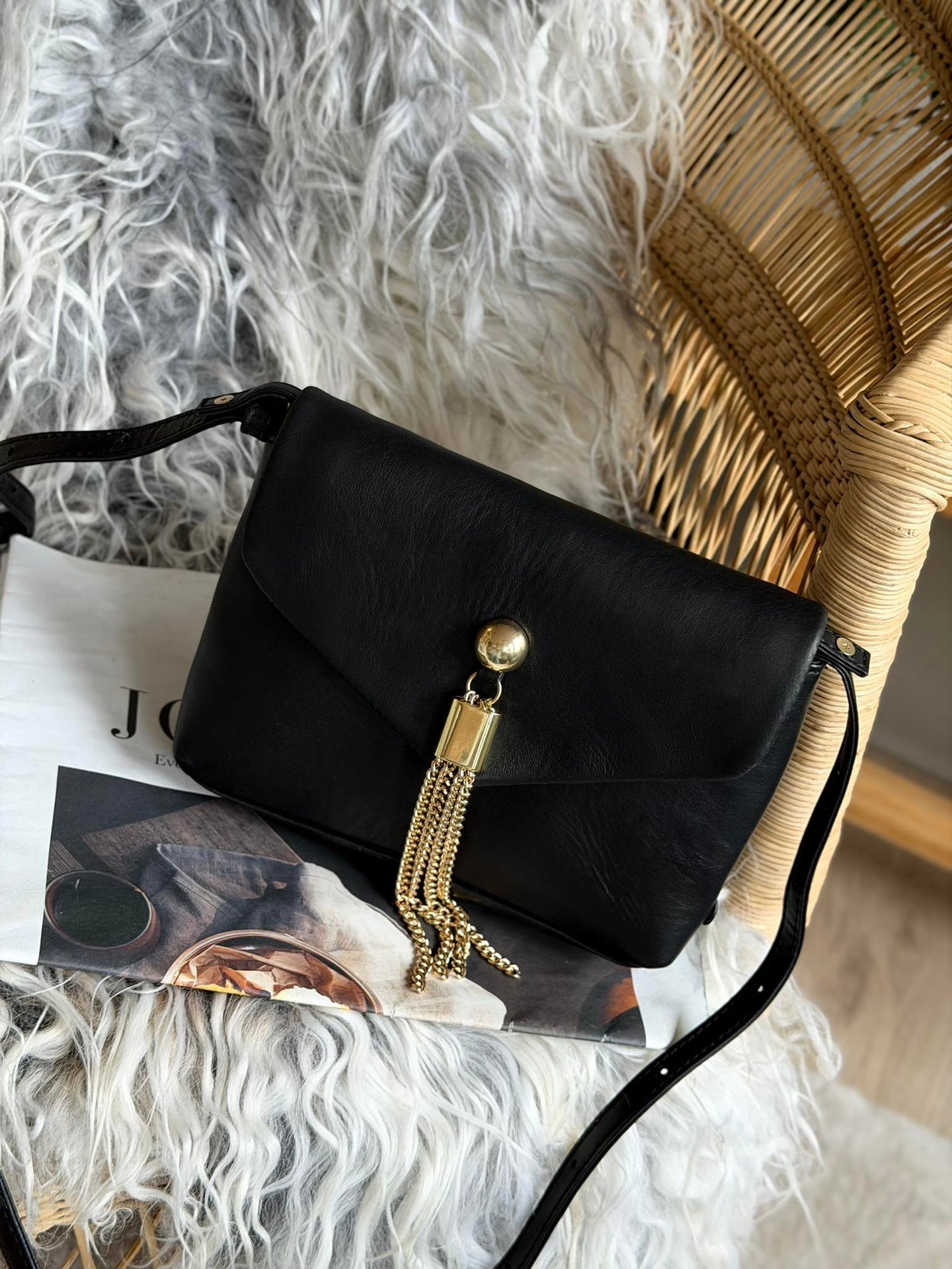 - Väskan har en guldfärgad kedjedetalj och nitar på framsidan