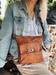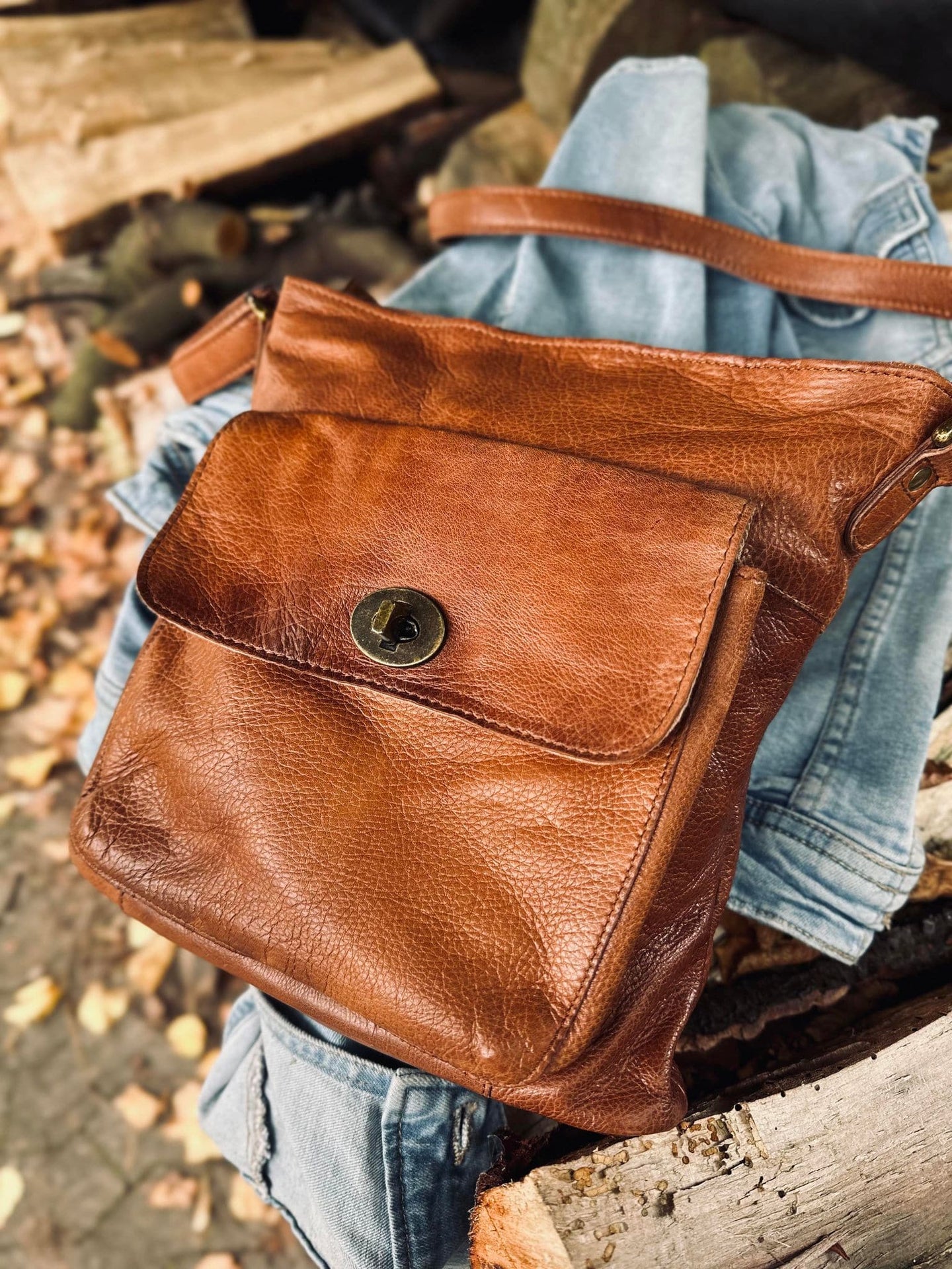- Medelstor och mjuk korsväska i läder med distinkt metallvridlås för främre fickan