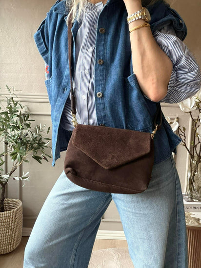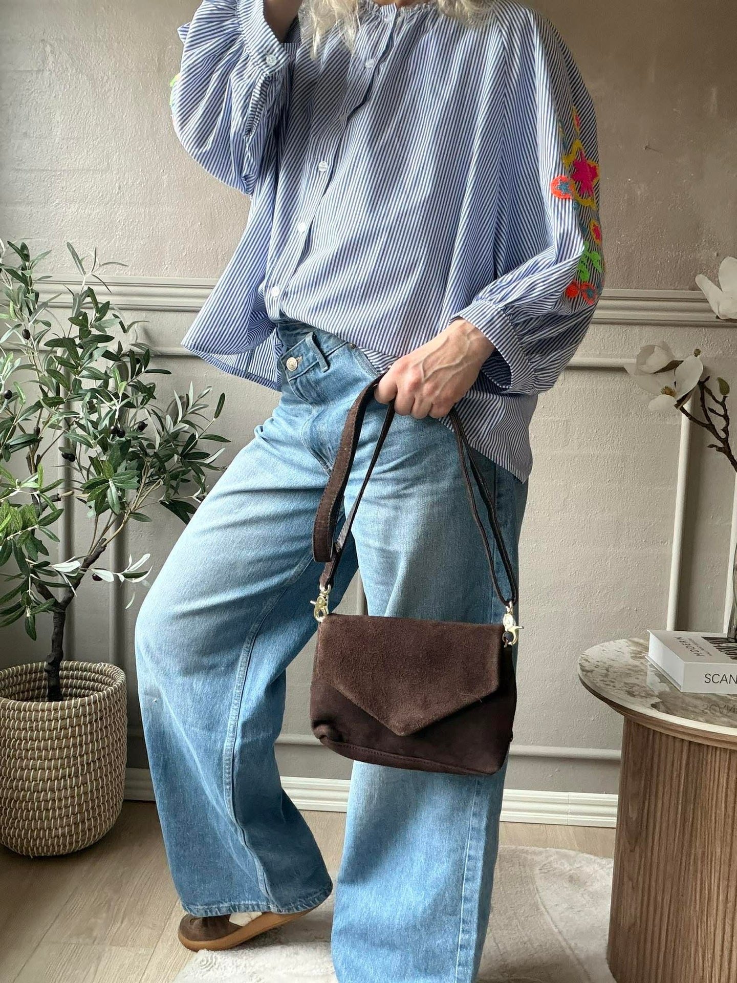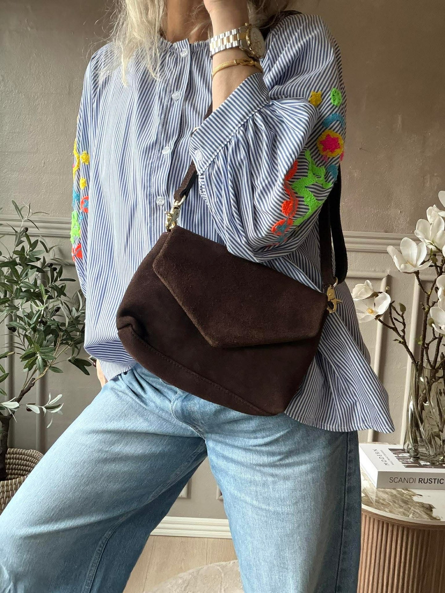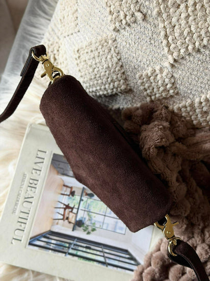 Axelremsväskan är tillverkad av 100 % äkta ruskinn, vilket ger en naturlig hållbarhet och en tidlös stil. Materialet är slitstarkt och motståndskraftigt mot vardagligt slitage, vilket gör väskan till en långvarig följeslagare. Med sin mjuka textur och unika mönster från ruskinnet erbjuder väskan en känsla av kvalitet och autenticitet som förbättrar varje outfit.