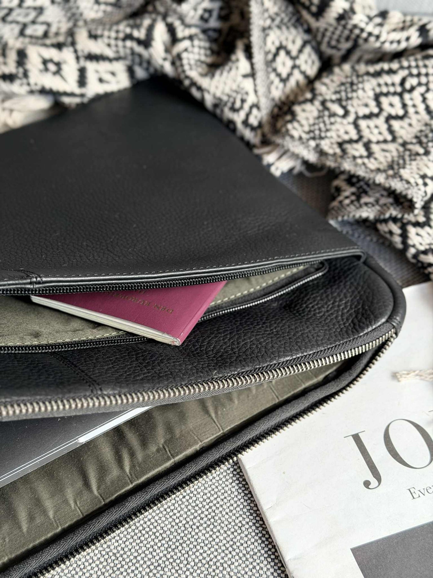 Denna datorväska i läder utstrålar en lyxig känsla tack vare dess handsydda detaljer. Handsömnaden garanterar inte bara en elegant finish, den säkerställer också väskans hållbarhet och lång livslängd. Detta gör att det inte bara är en praktisk tillgång för att skydda din dator, utan också ett utmärkt tillägg till din professionella stil.