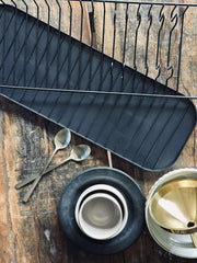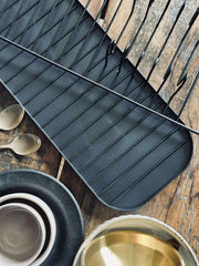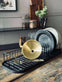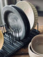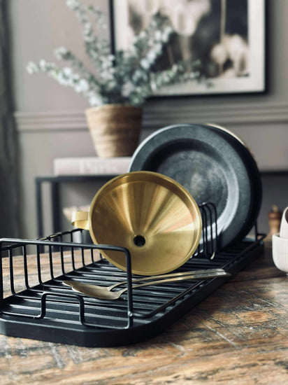 Diskstället är tillverkat av svart metall och plast, vilket ger en kombination av hållbarhet och modern estetik. Den robusta metallramen säkerställer stabilitet och långvarig användning, medan plastdetaljerna skyddar mot repor och skador på dina köksredskap. Denna materialblandning gör det lätt att rengöra och underhålla, vilket bidrar till ett organiserat och stilrent kök.