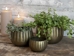 Detta är ett set av tre järnskjulare med mässingfärg och räfflad yta. De halvklotformade skålarna skapar ett vackert färgspel mellan gröna växter och varma mässingfärger, vilket bidrar till en mysig atmosfär. Designen har en modern estetik med en klassisk tvist, perfekt för hem med öga för detaljer.