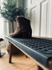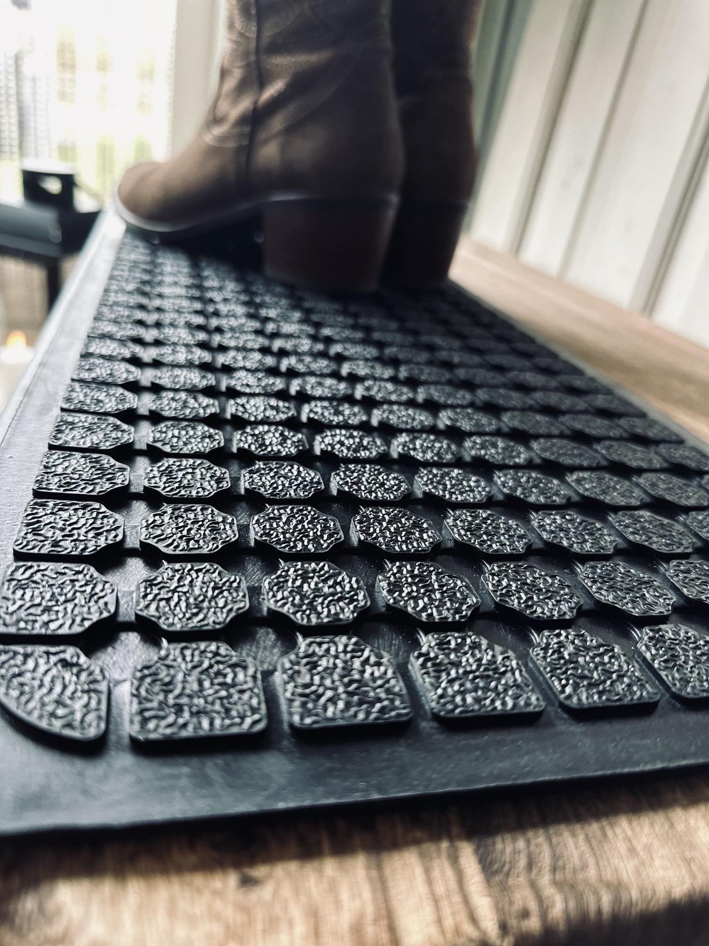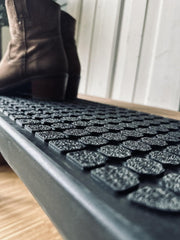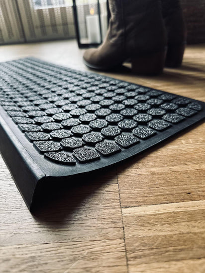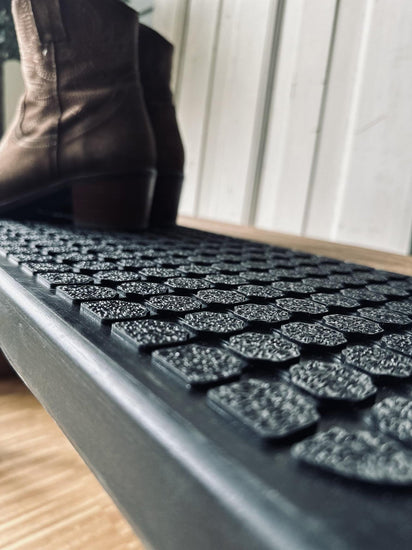 Detta är en svart trappmatta med en strukturerad yta. Mönstret består av upprepade sexkantiga former som ger en modern och funktionell känsla. Den strukturerade ytan verkar vara halkfri och väl lämpad för att fånga upp smuts och fukt. En praktisk och stilfull entré väntar med denna trappmatta.