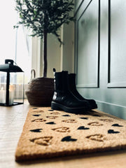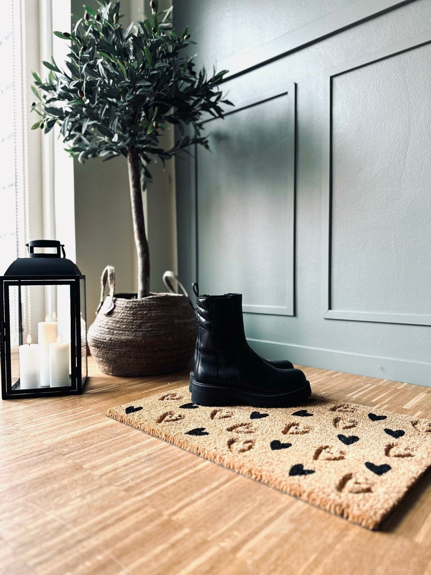 Denna dörrmatta pryds av ett hjärtformigt mönster med kontrasterande färger, vilket skapar en varm och välkomnande känsla. Mattan är inte bara en praktisk detalj i ditt hem, utan också ett dekorativt inslag som tillför personlighet och charm.
